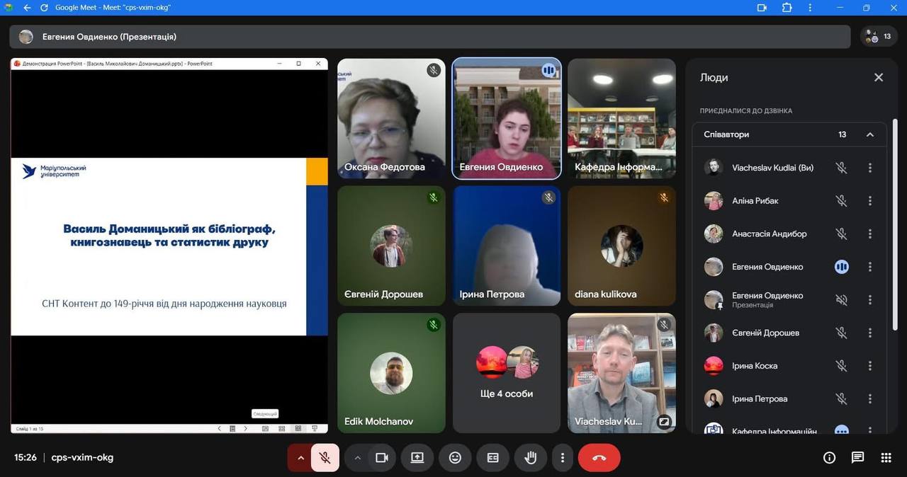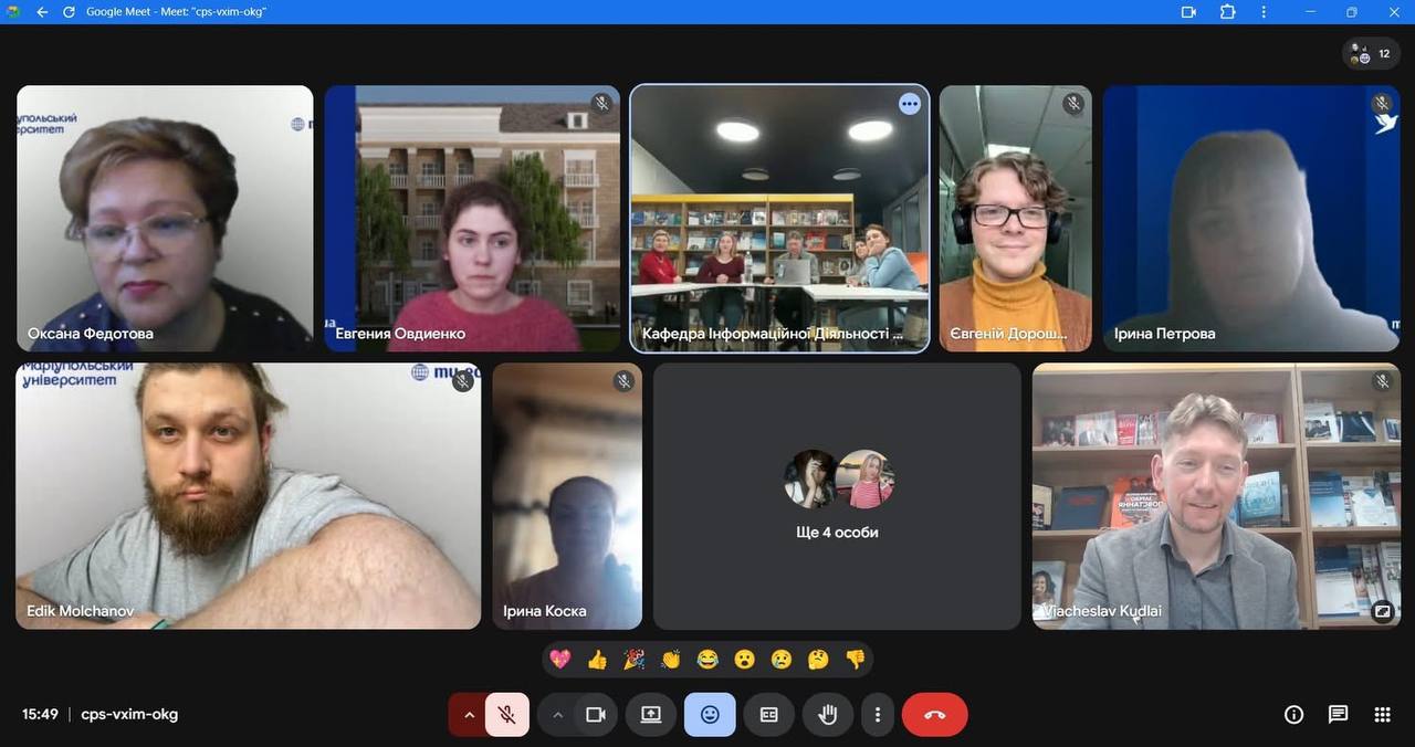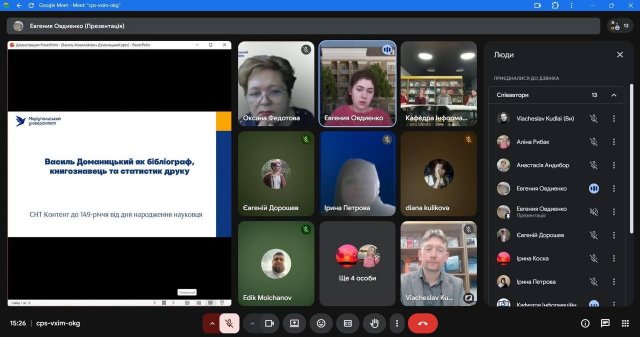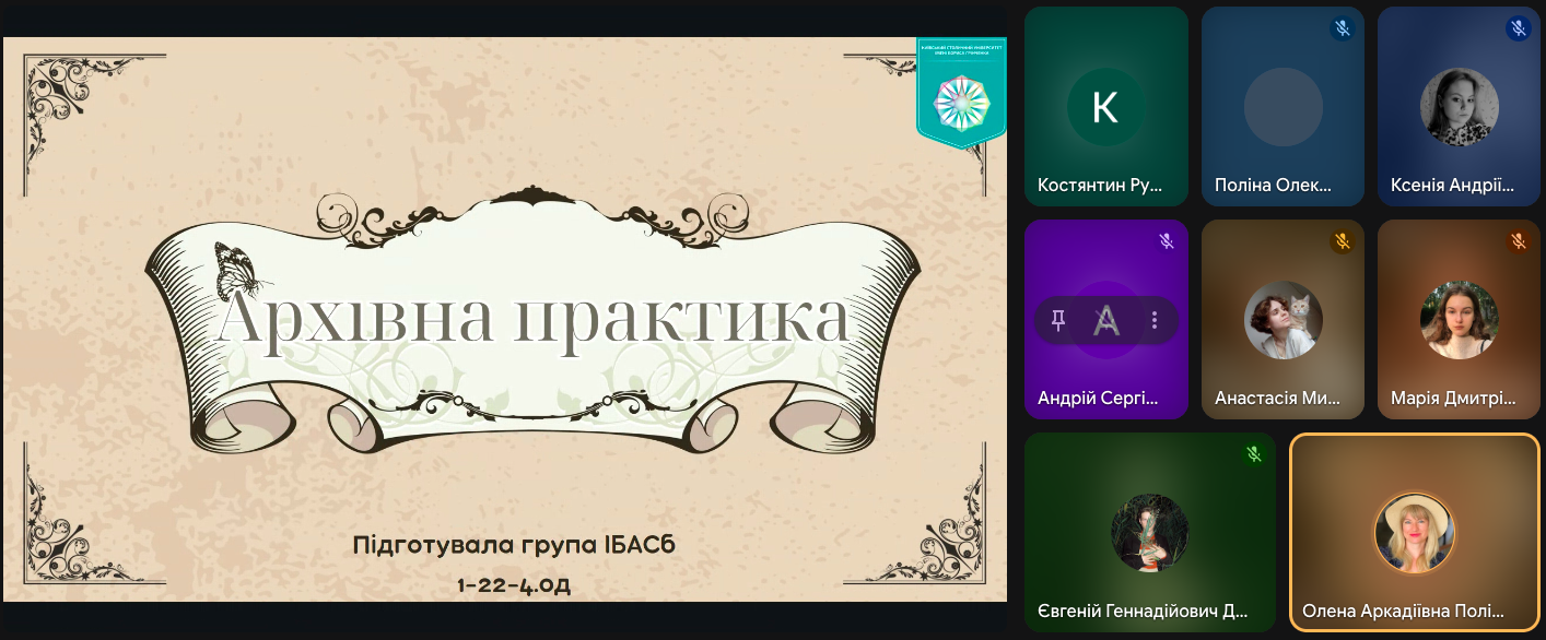8 грудня 2025 року відбулася онлайн зустріч здобувачів другого (магістерського) рівня освіти спеціальності 029 Інформаційна, бібліотечна та архівна справа Факультету української філології, культури і мистецтва із науковими керівниками кваліфікаційних робіт здобувачів та одночасно керівниками переддипломної практики – завідувачкою кафедри інформаційних комунікацій, кандидаткою історичних наук Оленою Політовою, професором кафедри, докткою наук із соціальних комунікацій Оленою Григоревською, доцентом кафедри, кандидатом історичних наук Ігорем Стамболом та представницею стейкхолдерів спеціальності – заступницею директора Центрального державного аудіовізуального та електронного архіву, кандидаткою історичних наук Оленою Косенко. Приводом для такої зустрічі стало обговорення підсумків переддипломної практики, яку з 10 листопада по 7 грудня 2025 р. здобувачі групи ІБАСм-1-24 1.4д – Олександра Горяінова, Петро Гордон, Андрій Кузьменко та Андрій Ткаченко проходили на базі ЦДАЕА.