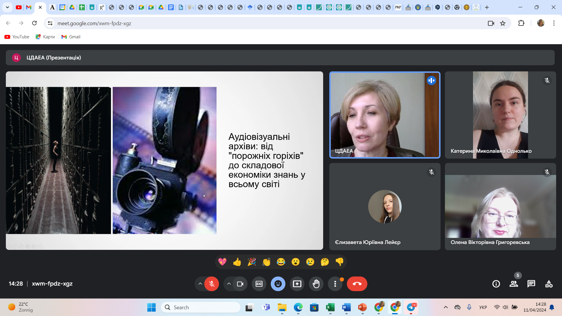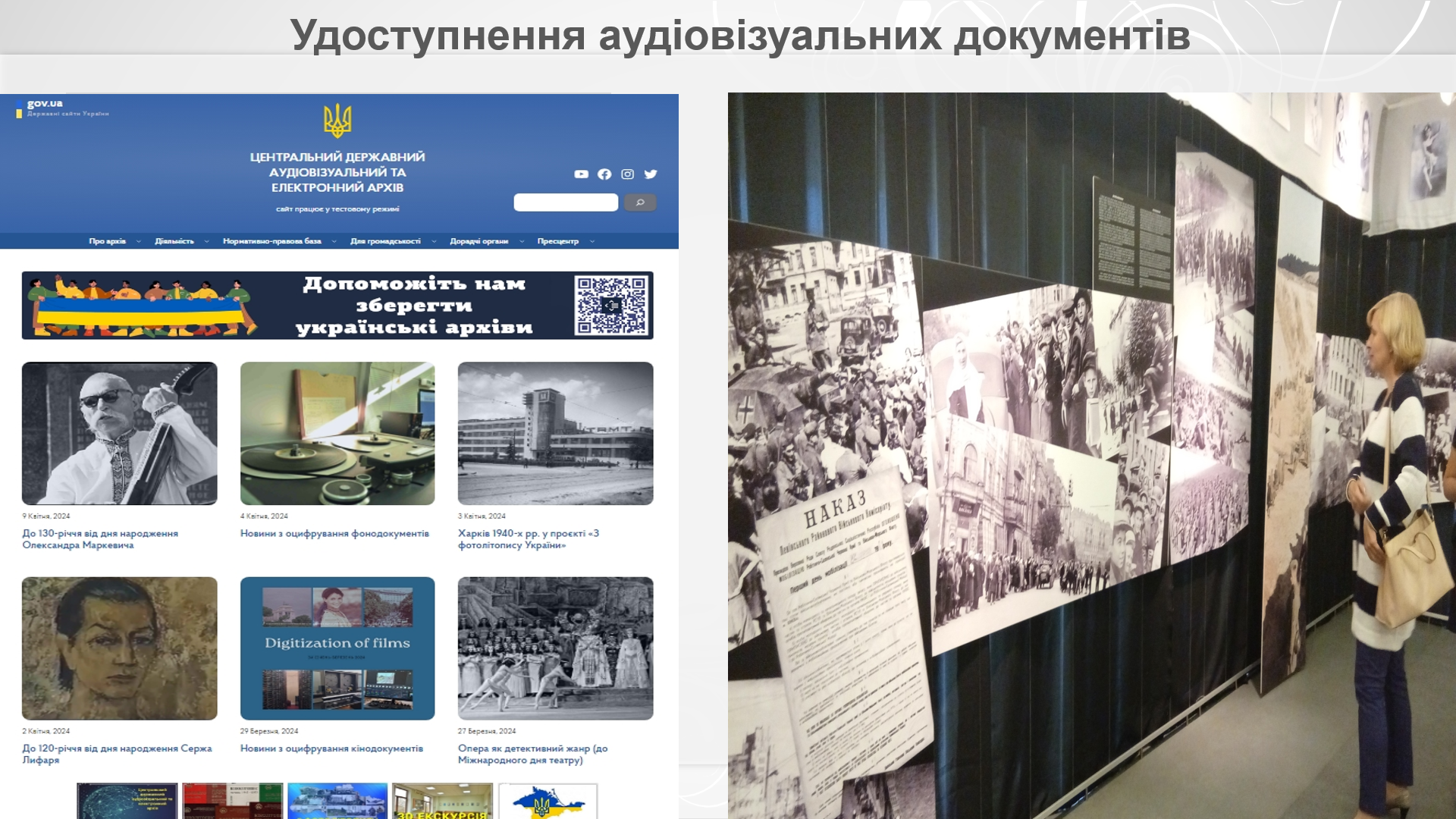 Магістри отримали повну та надзвичайно цікаву інформацію щодо формування фондів ЦДАВЕА, основних пріоритетів оцифровування аудіовізуальних документів, участі архіву у державній галузевій Програмі оцифрування архівних інформаційних ресурсів на 2022-2025 роки, затвердженої наказом Державної архівної служби України від 29.12.2021. У 2023 році архівом створено цифровий фонд користування на 414 од. обл. кінодокументів, 6700 од. обл, фонодокументів, 13324 од. обл. фотодокументів та 71 од. обл. відеодокументів. Загалом ЦДАВЕА станом на 01.01.2024 року оцифровано 183526 од. обл., що становить 35% від загальної кількості документів НАФ (524341 од. обл.). Таким чином «прихована спадщина», як часто називають архівні аудіовізуальні документи, стає доступною для активного використання у дослідженнях!