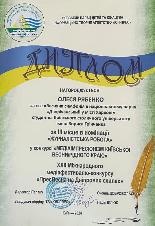 - ІІІ місце отримала Олеся Рябенко за есе «Весняна симфонія в національному парку «Дворічанський у місті Харкові» в номінації «Журналістська робота» у конкурсі «Медіаімпресіонізм Київської весни/рідного краю» ХХІІ Міжнародного медіафестивалю-конкурсу «ПресВесна на Дніпрових схилах».