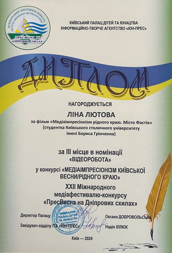 - ІІІ місце отримала Ліна Лютова за фільм «Медіаімпресіонізм рідного краю. Місто Фастів» в номінації «Відеоробота» у конкурсі «Медіаімпресіонізм Київської весни/рідного краю» ХХІІ Міжнародного медіафестивалю-конкурсу «ПресВесна на Дніпрових схилах».