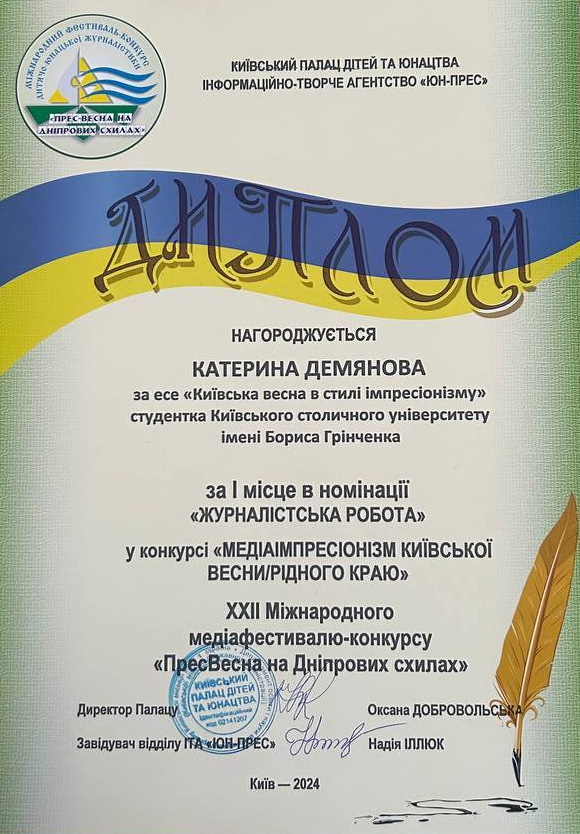 - І місце отримала Катерина Демянова за есе «Київська весна в стилі імпресіонізму» в номінації «Журналістська робота» у конкурсі «Медіаімпресіонізм Київської весни/рідного краю» ХХІІ Міжнародного медіафестивалю-конкурсу «ПресВесна на Дніпрових схилах».