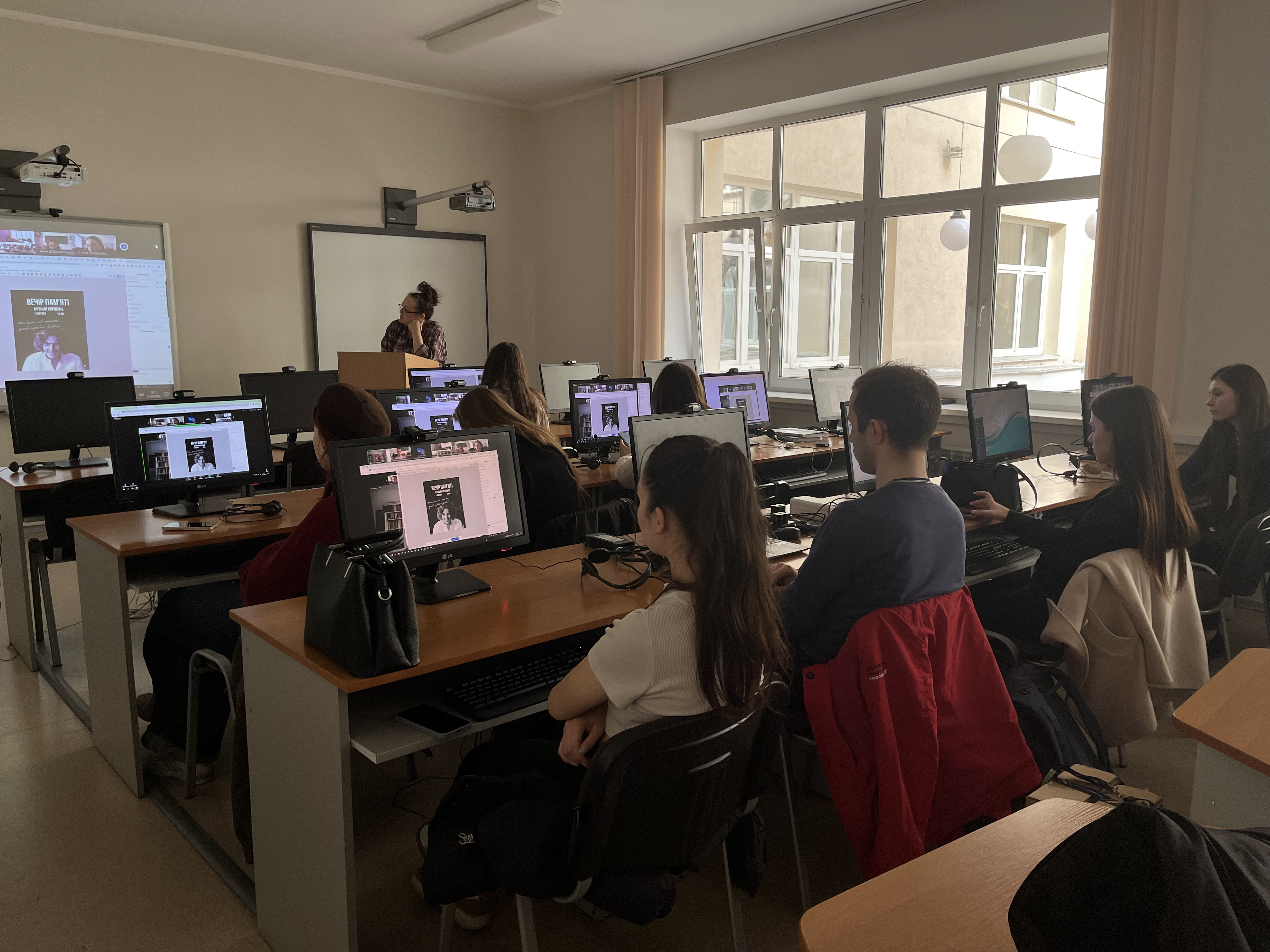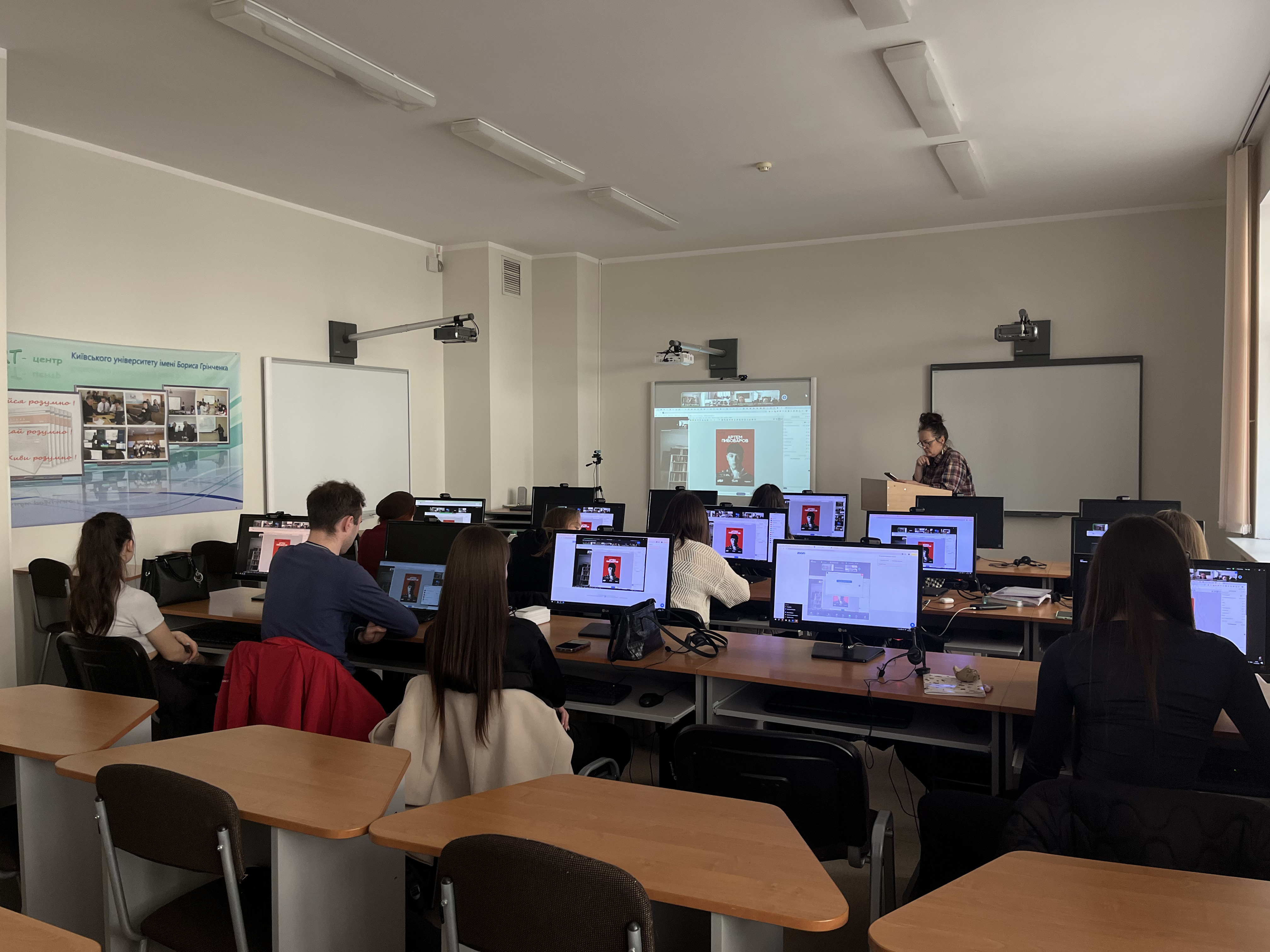 Студенти разом із  гостею  аналізували приклади відомих афіш до концертних заходів, розглядали особливості їх дизайну та намагалися створити власні концепції, спираючись на отримані знання.