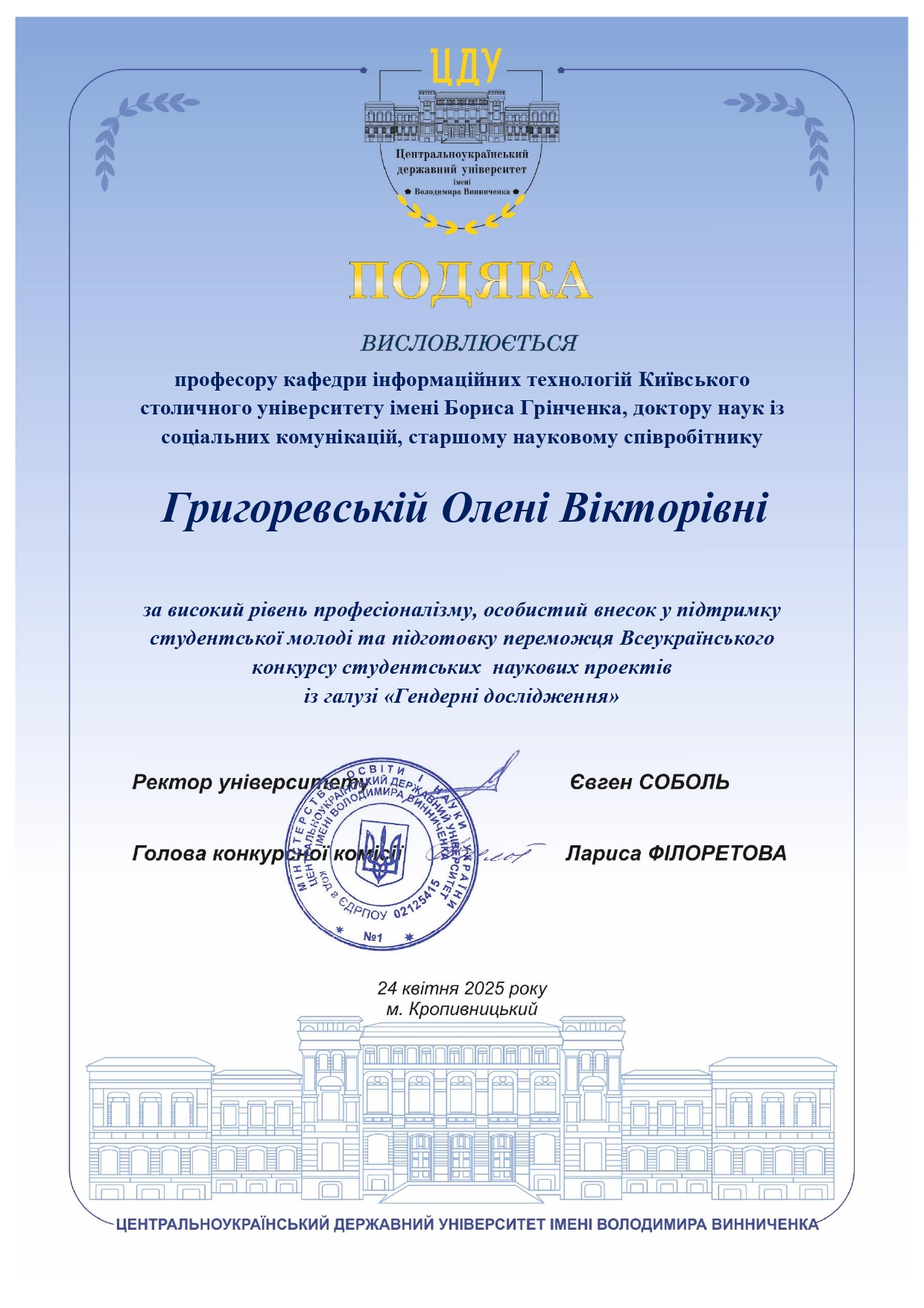 24 квітня 2025 р. на базі Центральноукраїнського державного університету імені Володимира Винниченка відбулася підсумкова науково-практична конференція Всеукраїнського конкурсу студентських наукових проєктів із галузі «Гендерні дослідження» з-поміж студентів закладів вищої освіти України.
