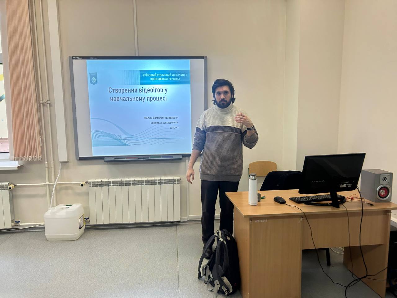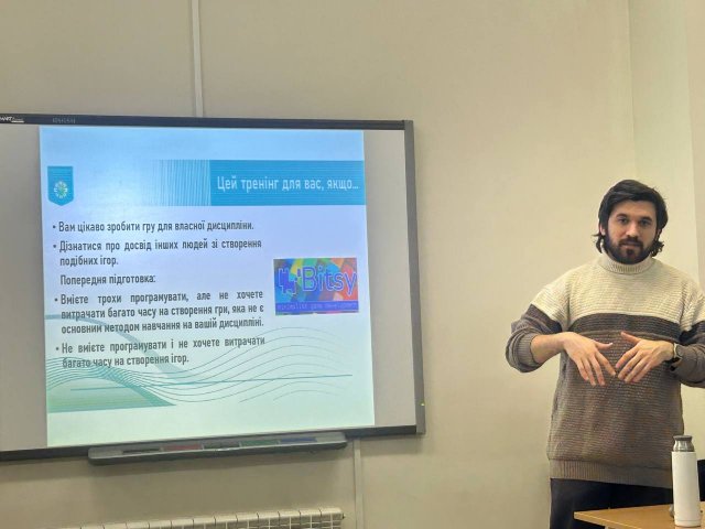 28 січня відбувся тренінг доцента Є. Малюка «Створення відеоігор у навчальному процесі». Учасникам було презентовано можливості використання відеоігор як інтерактивного освітнього інструменту, що поєднує елементи різних медіа та забезпечує досвідову взаємодію з навчальним матеріалом. Особливу увагу приділено роботі з платформою Bitsy як доступним інструментом швидкого створення навчальних ігор. Було продемонстровано приклади розроблених проєктів для низки навчальних дисциплін, а також запропоновано короткий практикум із реалізації базових механік гри. Для багатьох учасників це стало першим досвідом роботи з подібними цифровими інструментами.