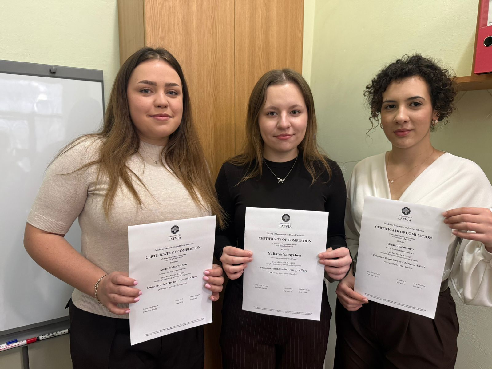 У 2025 р. співпраця в межах вищезазначеної освітньої програми була продовжена. В період з 8 вересня до 28 листопада 2025 р. здобувачки ОПП «Інформаційна, бібліотечна та архівна справа» другого (магістерського) рівня вищої освіти Олеся Білоусенко, Анна Максименко та Юліана Яцишин пройшли навчання за онлайн-програмою академічної мобільності «European Union Studies – Domestic Affairs» Факультету економіки та соціальних наук Латвійського університету. Успішність навчання засвідчена іменними сертифікатами здобувачок.