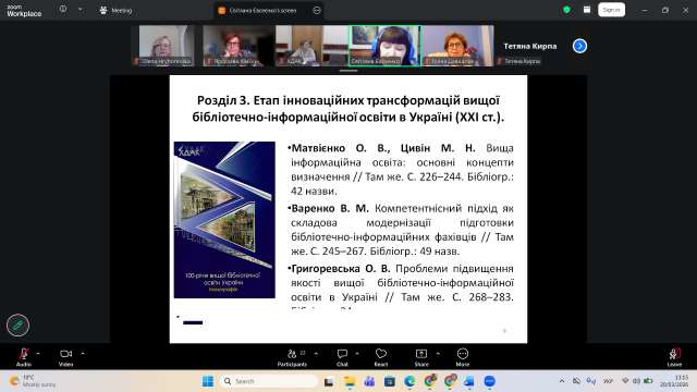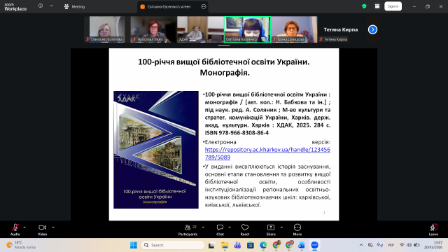 20 березня 2026 р. на базі Харьковської державної академії культури відбулася презентація колективної монографії «100-річчя вищої бібліотечної освіти в Україні» (Харків, 2025), яка з’явилася, оформилася і була видрукована у надзвичайно складних умовах воєнної доби завдякуючи підтримці засновника Товариства гуманістів ім. Григорія Сковороди пана Олега Чуба та наполегливості наукового редактора видання, проректора з наукової роботи ХДАК, доктора педагогічних наук, професора Алли Соляник. Монографія складається з трьох розділів, 11 статей 16 авторів, зміст яких охоплює етапи зародження вищої бібліотечної освіти на теренах України (кінець ХІХ – початок ХХ ст.), розбудови відповідної інфраструктури вищої бібліотечно-інформаційої освіти (1930-1990-ті рр.) та етап інноваційних трансформацій (ХХІ ст.). До написання третього розділу монографії долучилася професор кафедри інформаційних комунікацій, доктор наук із соціальних комунікацій Олена Григоревська із дослідженням «Проблеми підвищення якості вищої бібліотечно-інформаційої освіти в Україні». Монографія буде використовуватися в навчальному процесі для підготовки здобувачів спеціальності В13 Бібліотечна, інформаційна та архівна справа, буде доступна у фондах Бібліотеки Університету Грінченка, а її електронна версія вже є в інституційному репозиторії ХДАК.