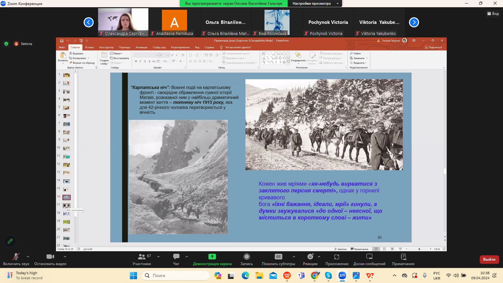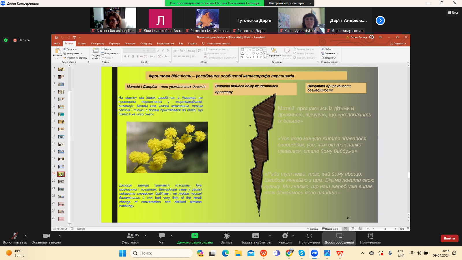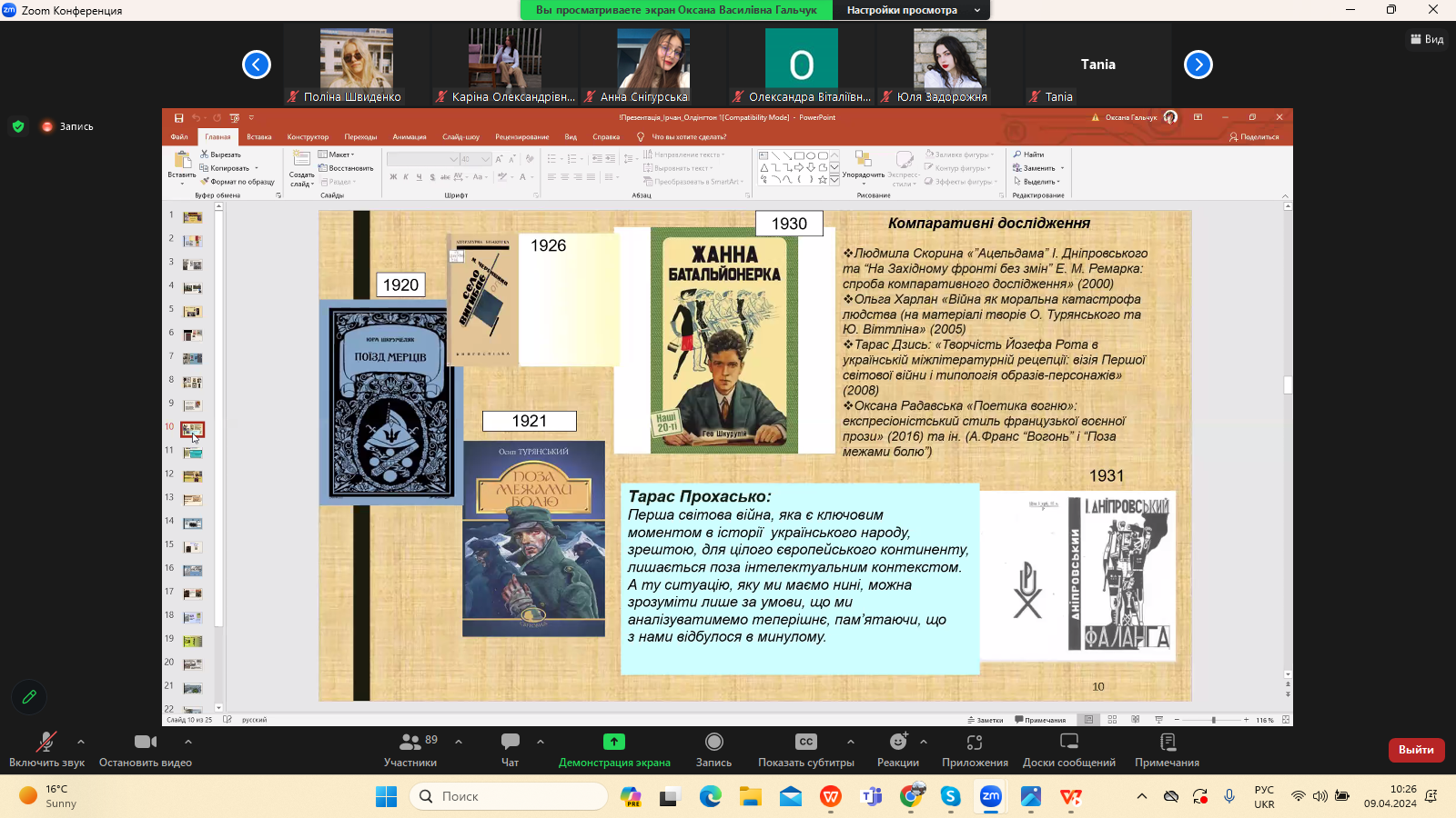 9 квітня 2024 р. в межах програми Дня Факультету української філології, культури і мистецтва відбулася гостьова лекція доктора філологічних наук, професора кафедри зарубіжної літератури Прикарпатського національного університету імені Василя Стефаника Іванни Девдюк “Хронотоп війни: художні візії Мирослава Ірчана і Річарда Олдінгтона".