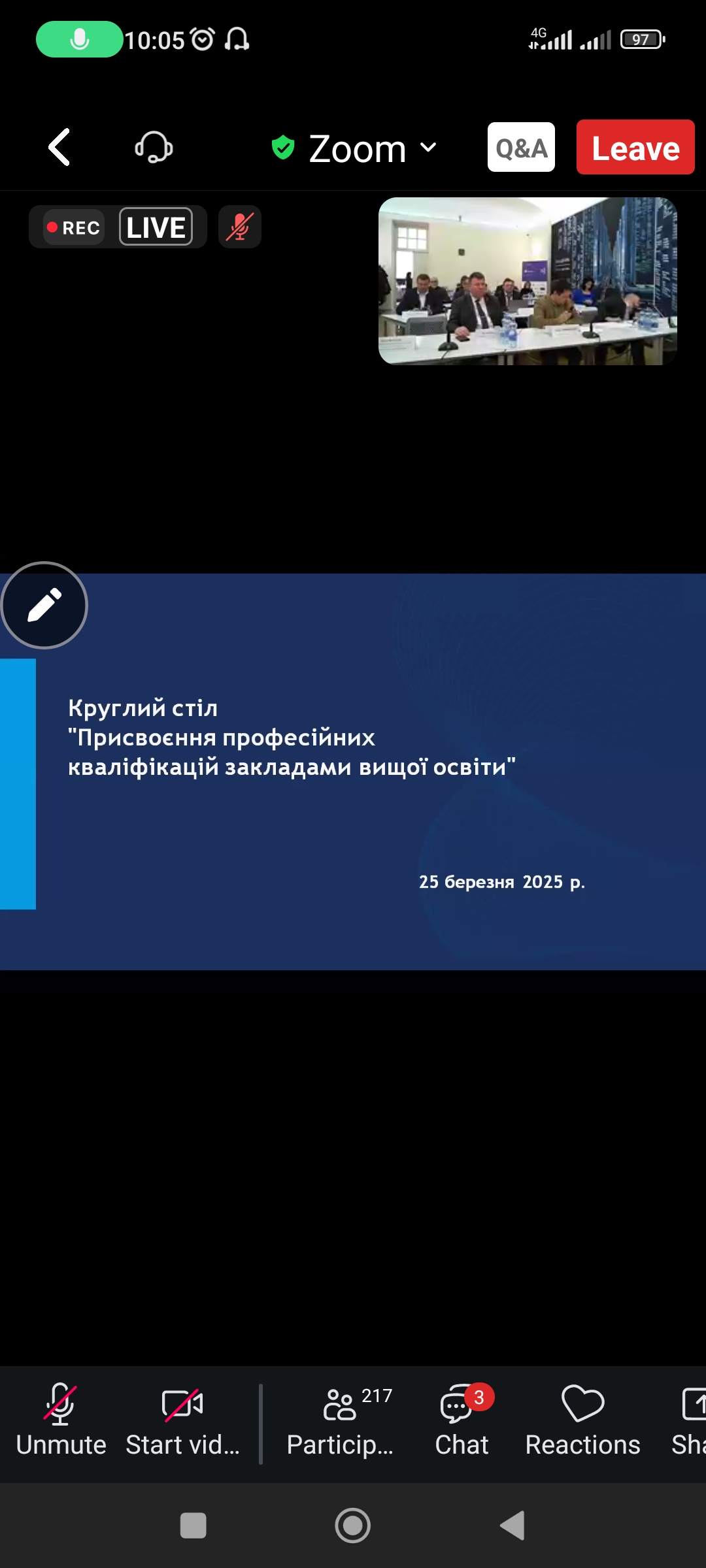 25 березня 2025 р. на базі Київського національного університету імені Тараса Шевченка було проведено круглий стіл на тему: «Присвоєння професійних кваліфікацій закладами вищої освіти в разі відсутності професійного стандарту: проблематика та шляхи вирішення».