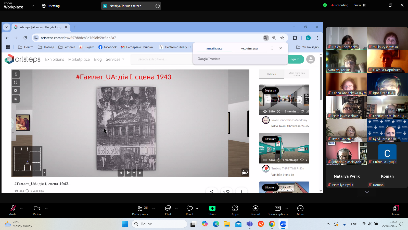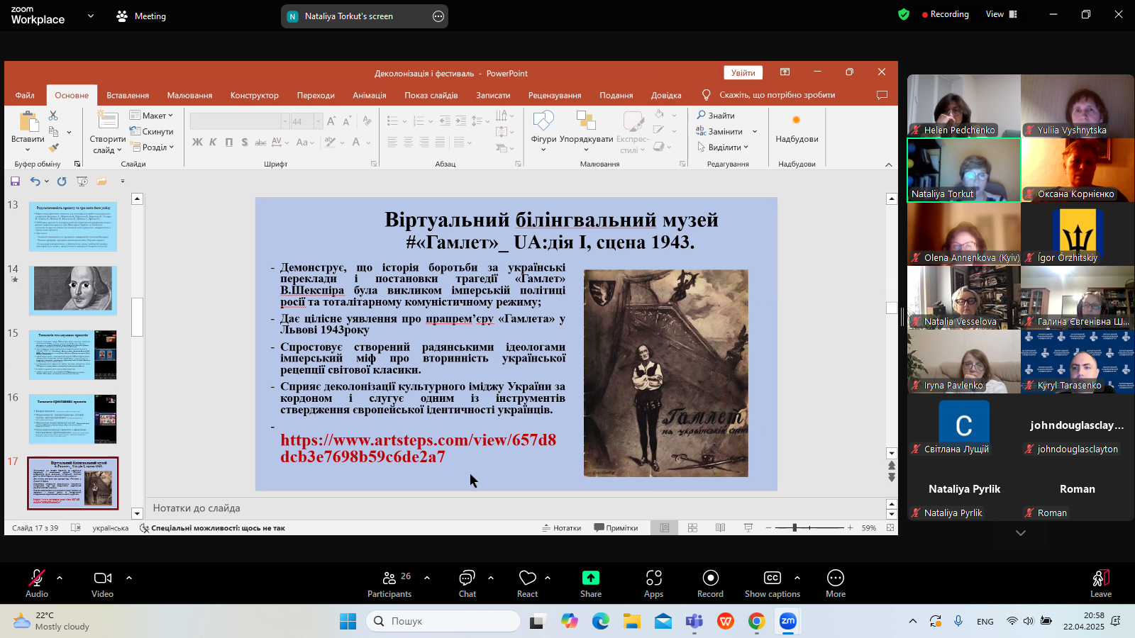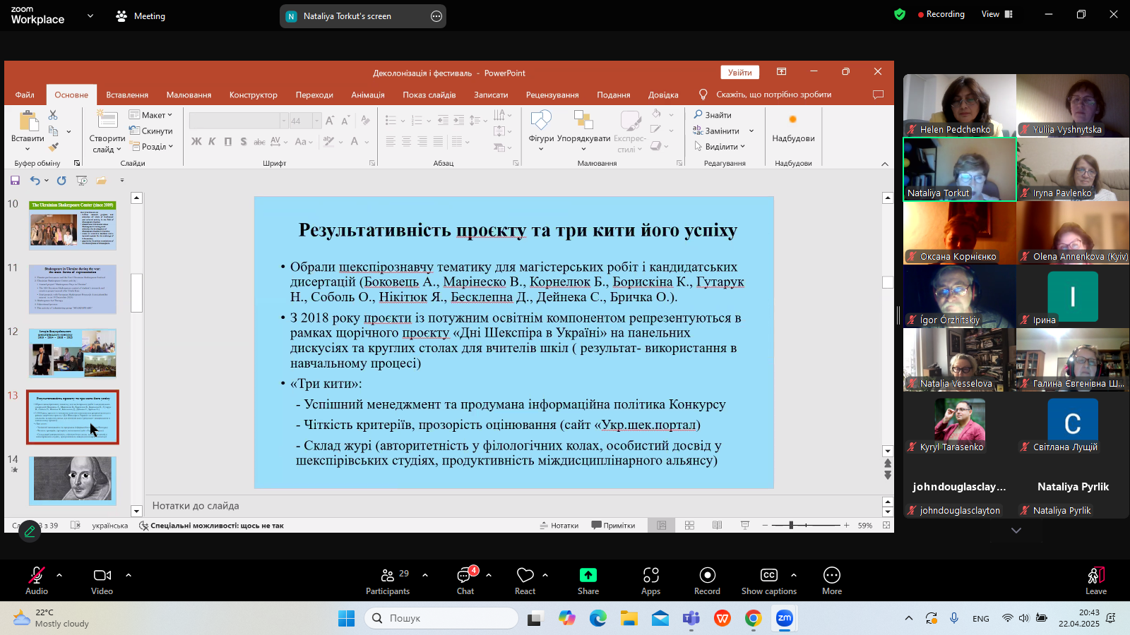 22 квітня 2025 р. всі охочі - залюблені в Шекспіра і ті, хто лише відкриває для себе Великого Барда - мали змогу відвідати онлайн-лекцію доктора філологічних наук, професора Запорізького національного університету, засновниці й очільниці Українського шекспірівського центру, академіка Академії наук вищої школи України, членкині Європейської асоціації шекспірознавців (ESRA), професора Наталії Торкут.
