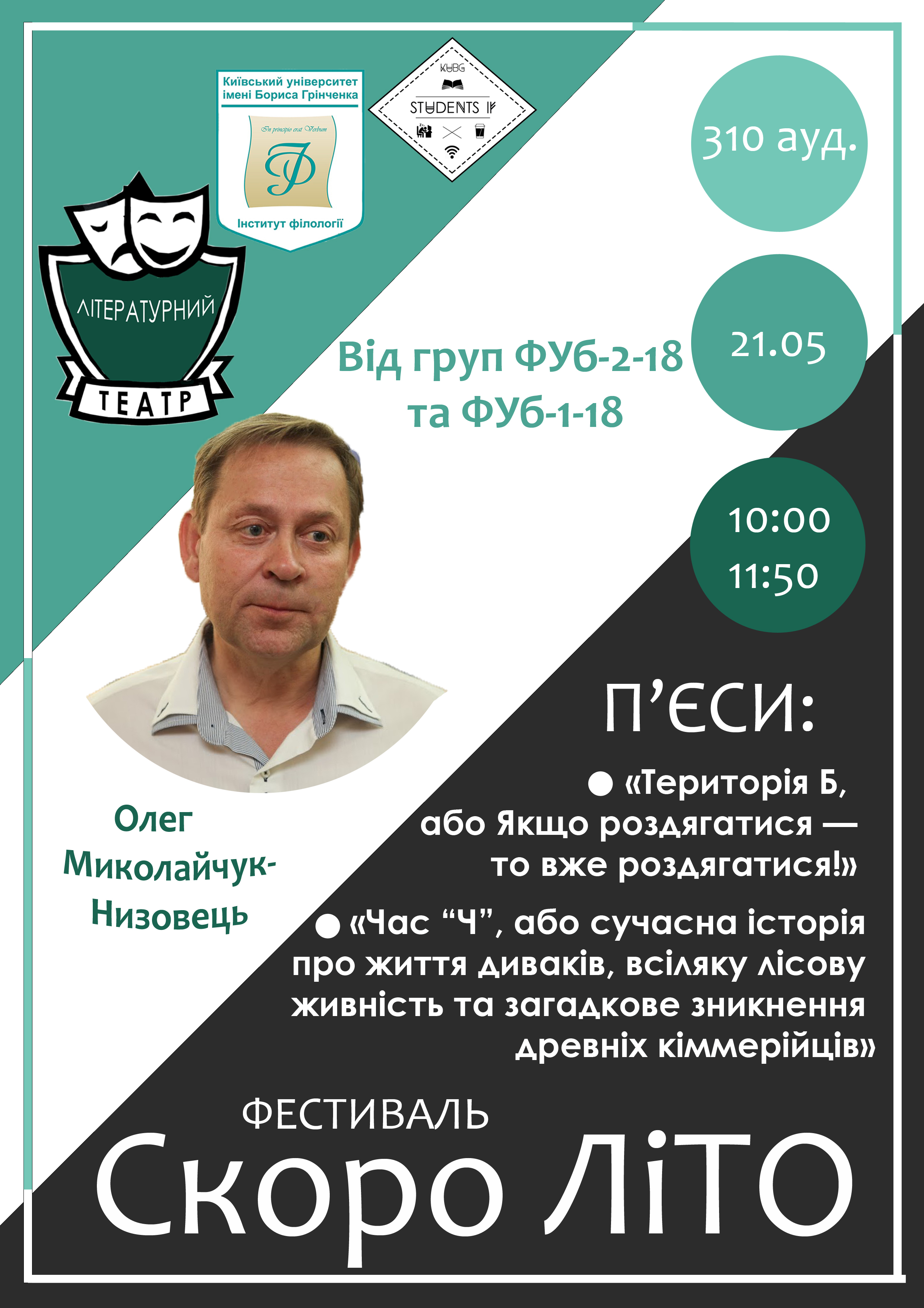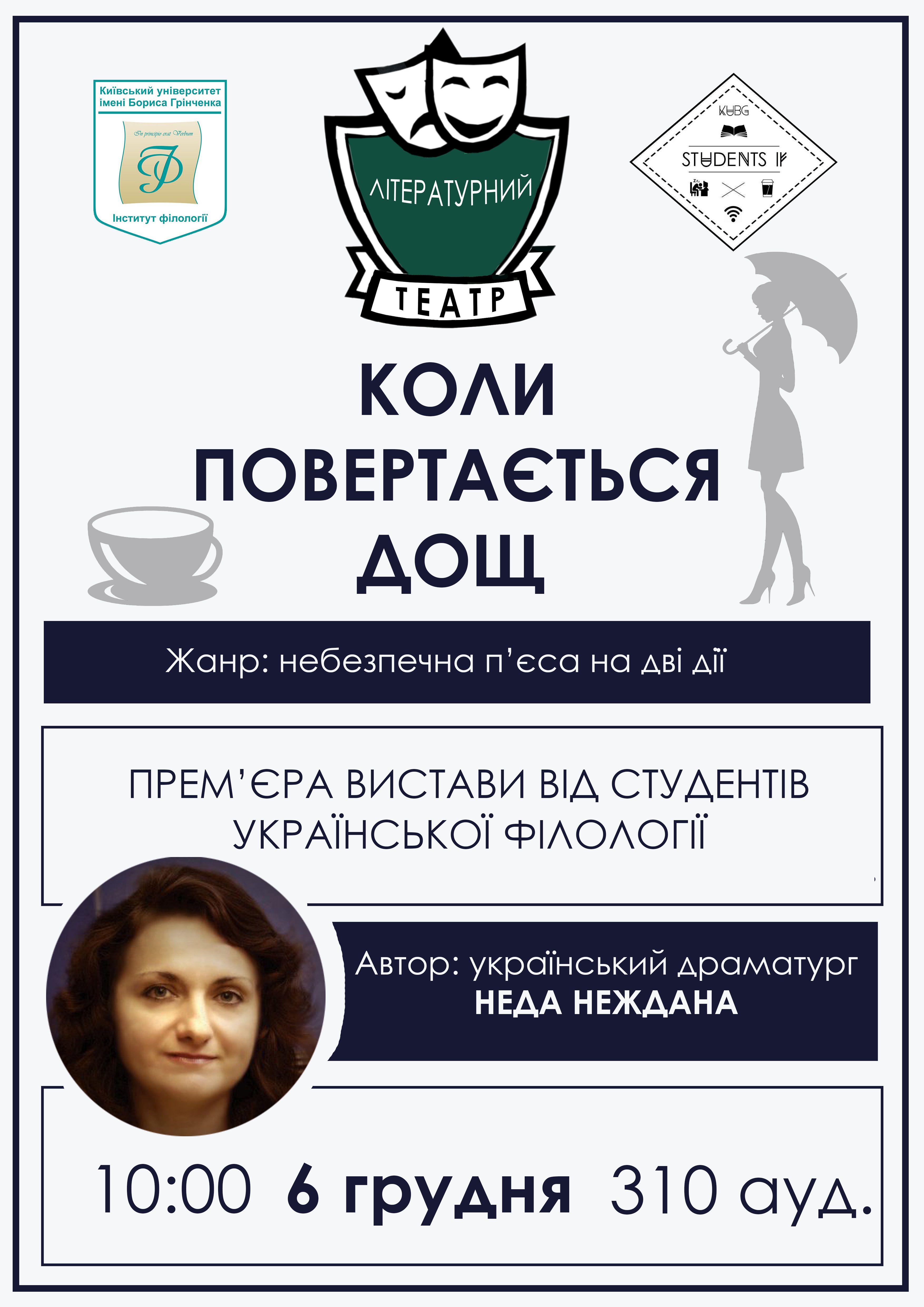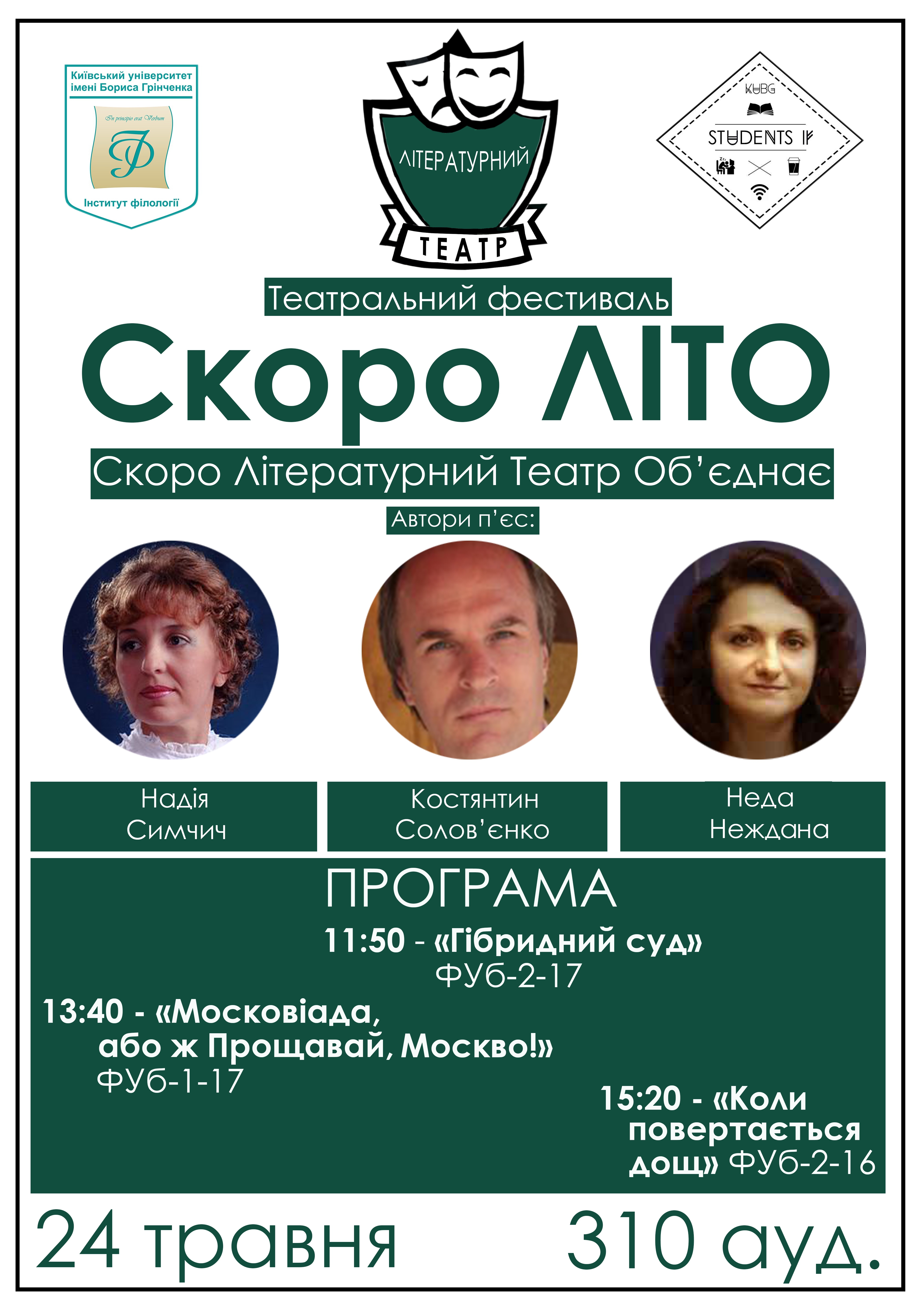 19 травня 2023 року у форматі «Театр перед мікрофоном» відбувся VI Cтудентський театральний міні-фестиваль "Скоро ЛІТО", у якому студенти та студентки групи ФУБ-1-22-4.0д представили фрагменти шести п'єс українських драматургів: «Мина Мазайло» Миколи Куліша, «Цикута для Сократа» Валерія Герасимчука, «Станція, або Розклад бажань на завтра» Олександра Вітра, «Голос тихої безодні» Неди Нежданої, «Захриплий голос тиші» Олега Миколайчука, «Кицька на спомин про темінь» Неди Нежданої. Режисерка постановок – ст.викладачка кафедри української літератури, компаративістики та грінченкознавства Наталія Олексіївна Блохіна, яка вп'яте проводить фестиваль у межах навчальної дисципліни «Практикум з української літератури. Виразне читання». Приємним сюрпризом стало те, що поважною гостею на фестивалі була Неда Неждана - авторка двох п'єс, які презентувало студентство.