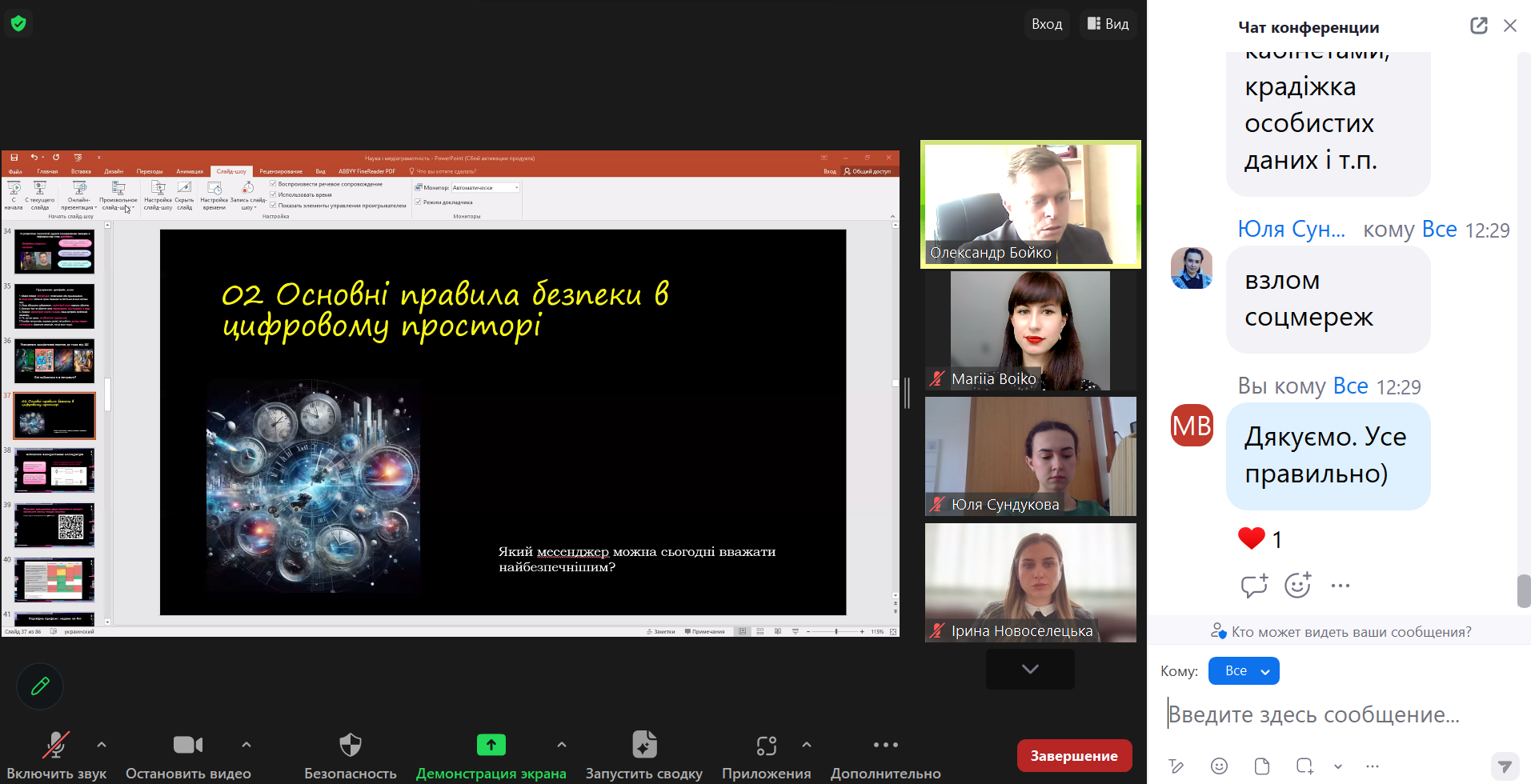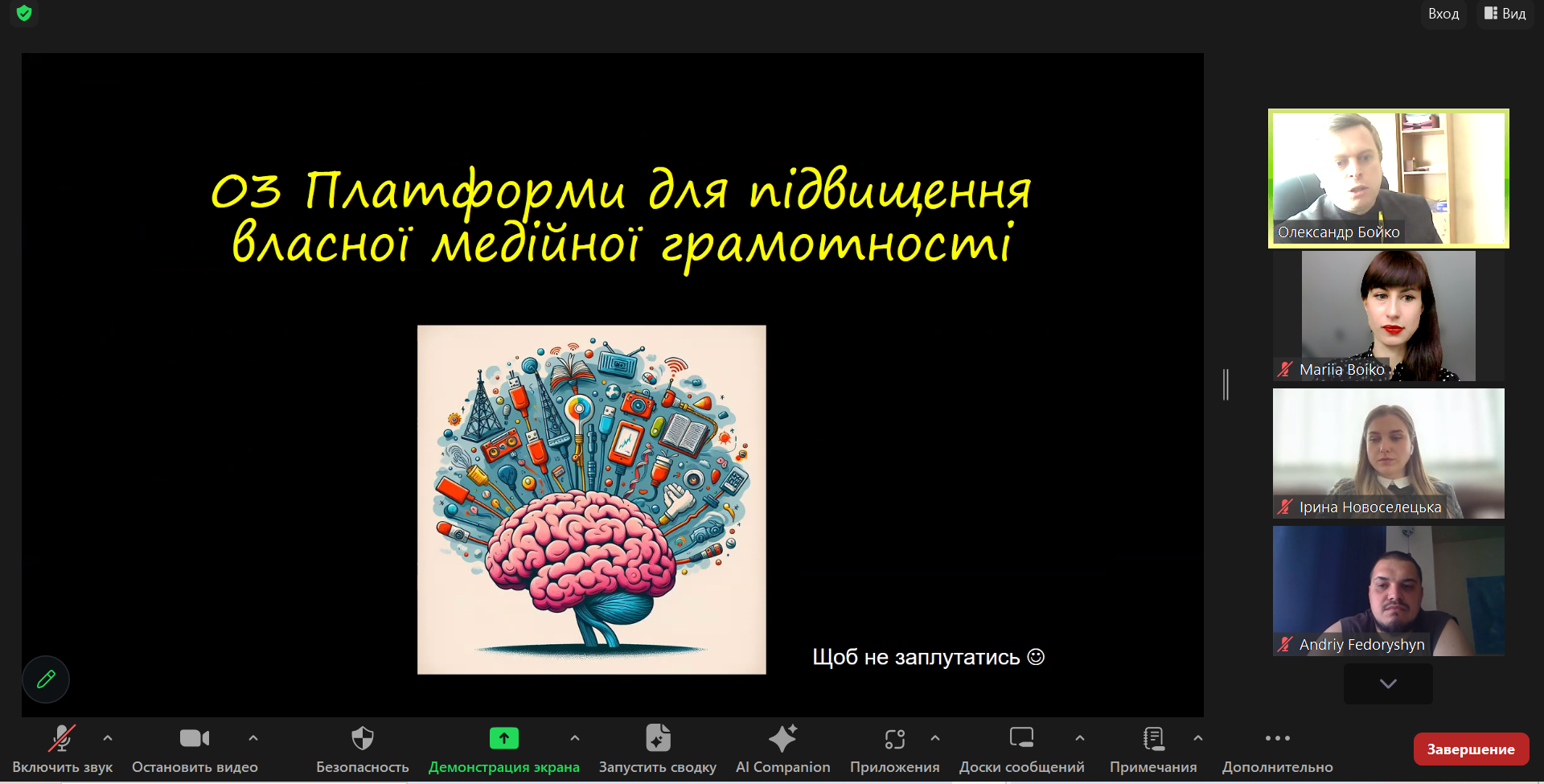 Під час заходу розглянули основні правила безпеки в інформаційному просторі, проаналізували сучасні українські платформи для підвищення власної медійної грамотності. Також учасники воркшопу дізналися про взаємозв’язки між академічною доброчесністю та медіаграмотністю.