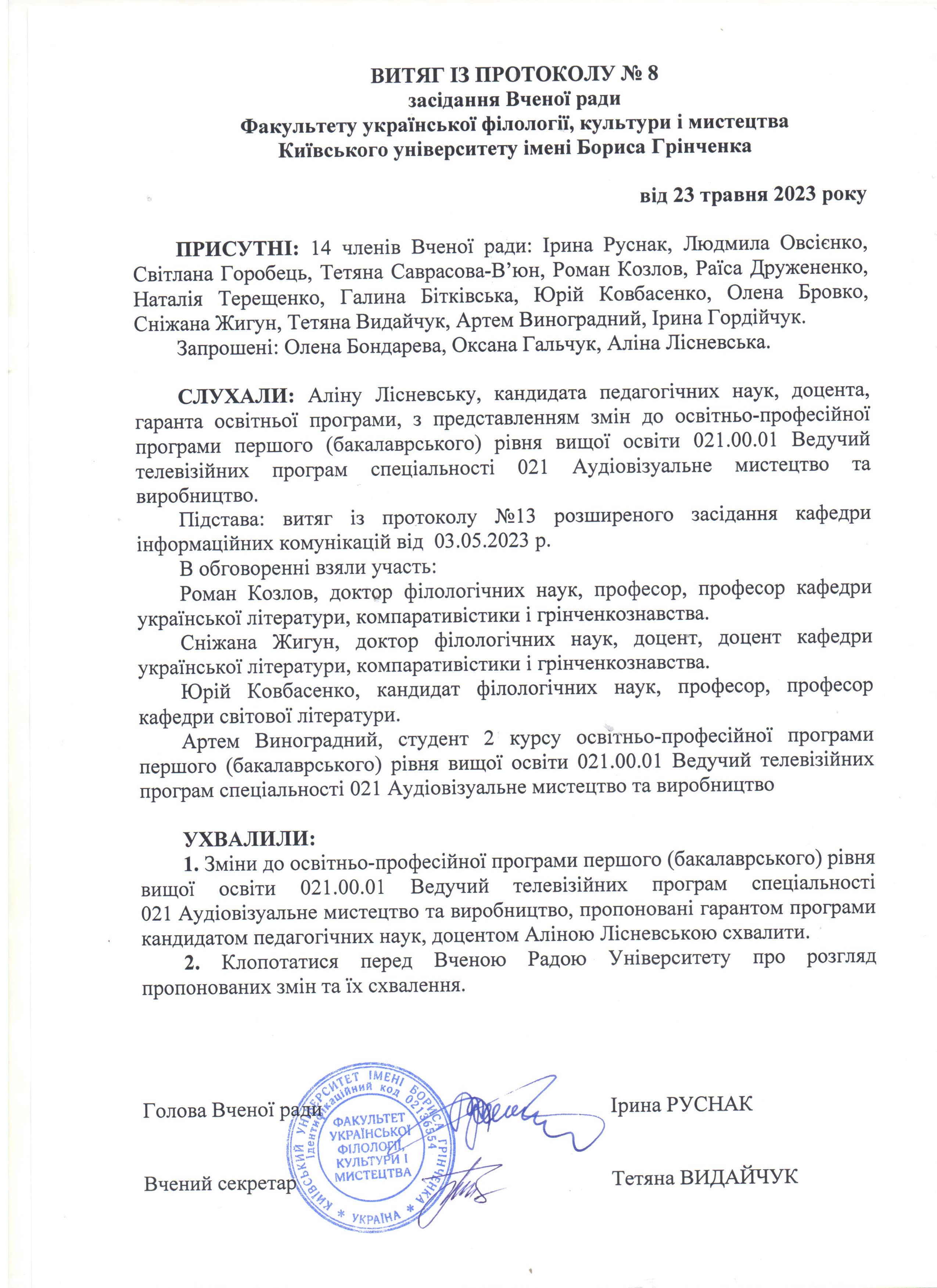 ОСВІТНЬО-ПРОФЕСІЙНА ПРОГРАМА "ВЕДУЧИЙ ТЕЛЕВІЗІЙНИХ ПРОГРАМ" спеціальності 021 "Аудіовізуальне мистецтво та виробництво"