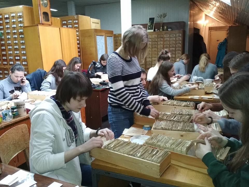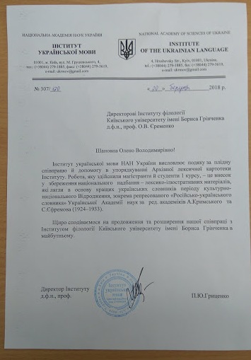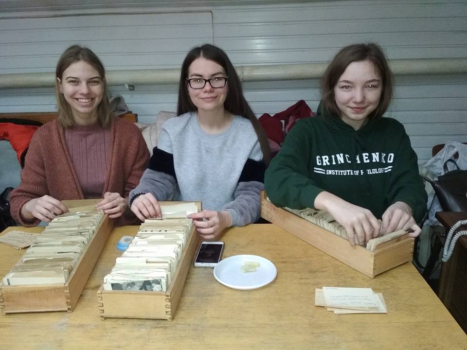 Студенти-україністи І та VІ курсів під час проходження практики з прикладної лінгвістики мали унікальну нагоду попрацювати в лексичній картотеці з упорядкування матеріалів "Російсько-українського словника" за редакцією академіків А.Кримського та С.Єфремова Інституту української мови НАН України. Затишну наукову атмосферу нашим студентам створила давній друг Інституту філології, постійний учасник наших лексикографічних конференцій кандидат філологічних наук старший науковий співробітник відділу лексикології, лексикографії та структурно-математичної лінгвістики Оксана Миколаївна Тищенко. Нові слова, труднощі перекладу і картки, писані й опрацьовані майже сто років тому корифеями української філології, надихнули грінченківців на плідну й конструктивну роботу, гідно оцінену дирекцією Інституту української мови. Тож співпраця Інституту філології Київського університету імені Бориса Грінченка та Інституту української мови НАН України триває! Чекаємо на нові проекти!