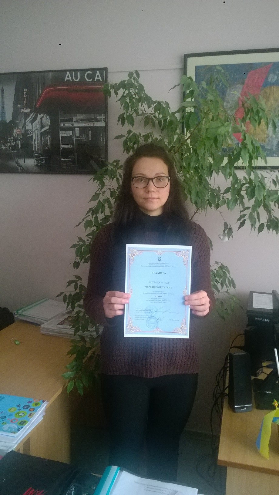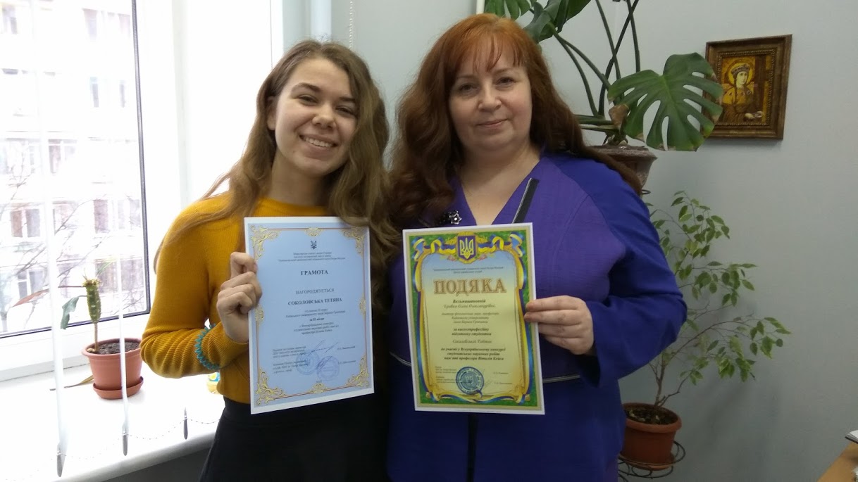 І МІСЦЕ – ЧЕРЕДНИЧОК ТЕТЯНА, студентка IV курсу Інституту філології Київського університету імені Бориса Грінченка, за роботу «Відтворення сенсорики в контексті поетики дому в українських перекладах малої прози Сандри Сіснерос» (науковий керівник – кандидат філологічних наук, доцент кафедри германської філології Гайдаш Анна Владиславівна).