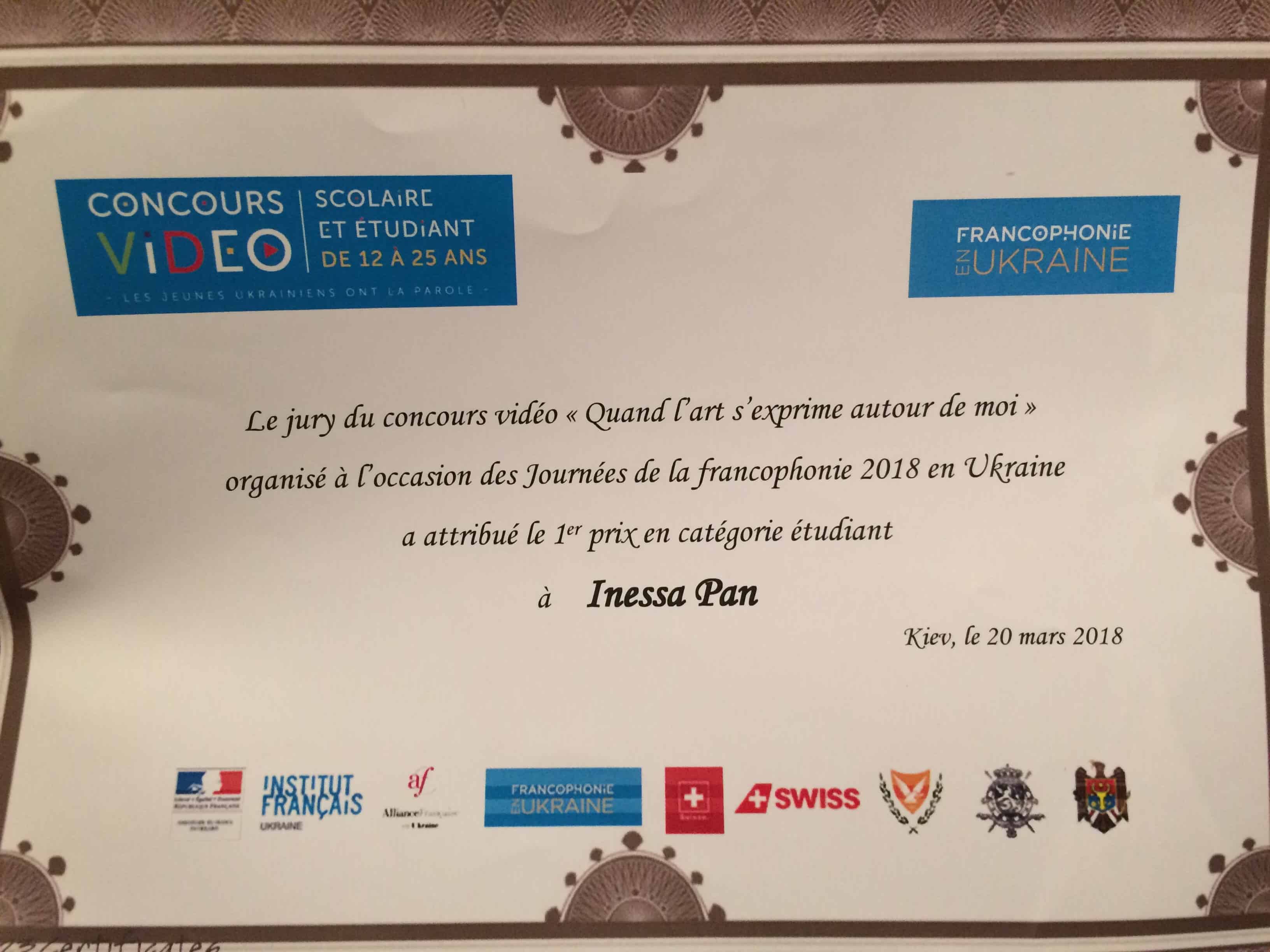 У січні 2018 року Посольства Франції та Швейцарії, Французький інститут в Україні та мережа Альянс Франсез в Україні оголосили конкурс відеофільмів до Всесвітнього тижня Франкофонії – 2018 «Коли мистецтво промовляє навколо мене!», до участі в якому були запрошені зокрема й студенти вищих навчальних закладів. Охочим перевірити свої режисерські та операторські здібності, а також рівень володіння французькою було запропоновано створити відеоролик французькою мовою на тему свободи художнього самовираження навколо нас. Учасники конкурсу мали провести дослідження у рідному місті або селищі та поділитися знятими на відео витворами вуличного мистецтва (Street Art), мистецького перформансу або іншими творчими знахідками. 20 березня високе журі підбило підсумки конкурсу й оголосило переможців. Серед студентів першість виборола студентка IV курсуІнституту філології спеціальності Філологія (мова і література французька) Інесса Пан.