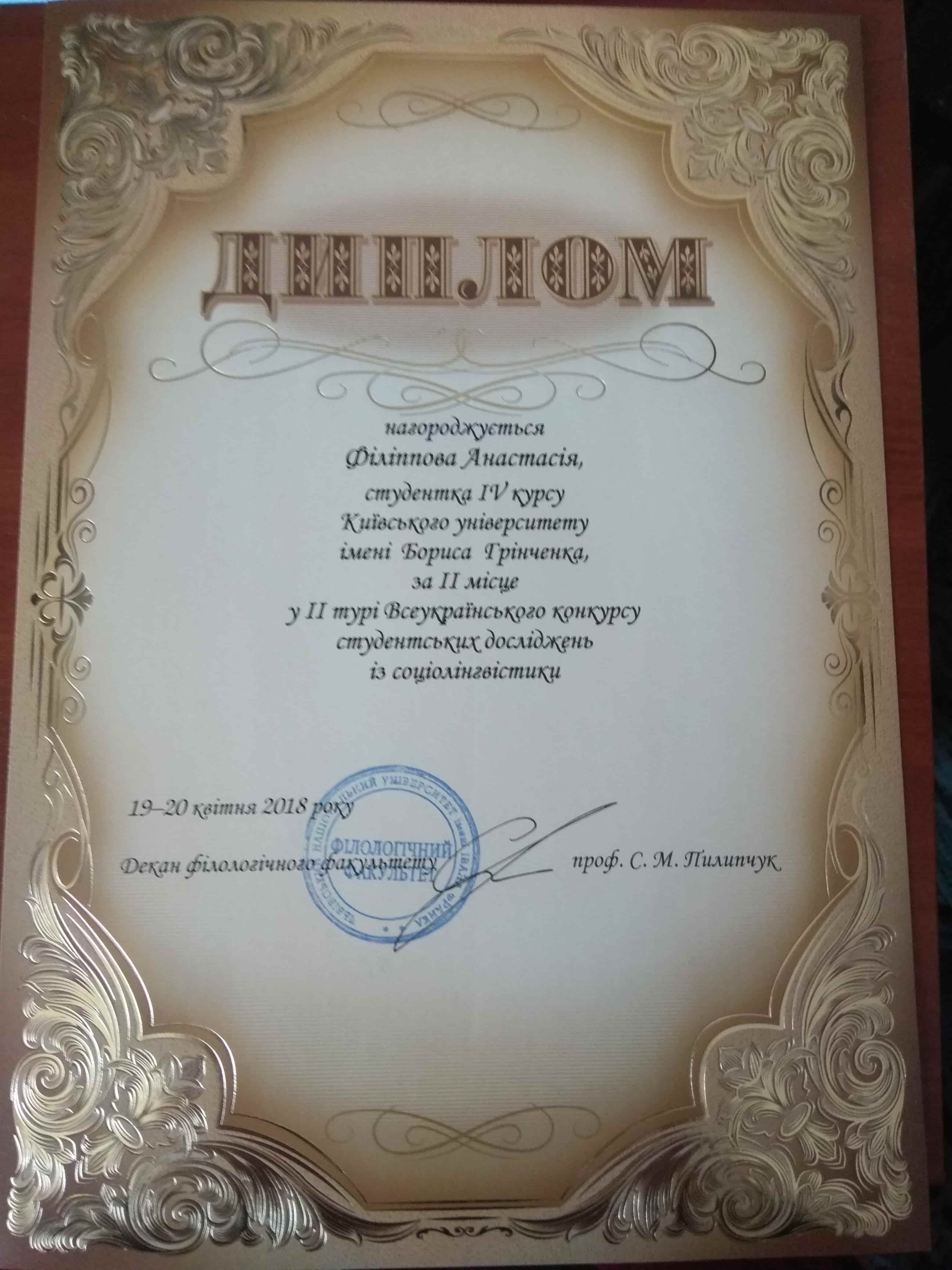За результатами Підсумкової науково-практичної конференції Анастасія Філіппова, студентка ІV курсу Інституту філології здобула диплом ІІ ступеню.