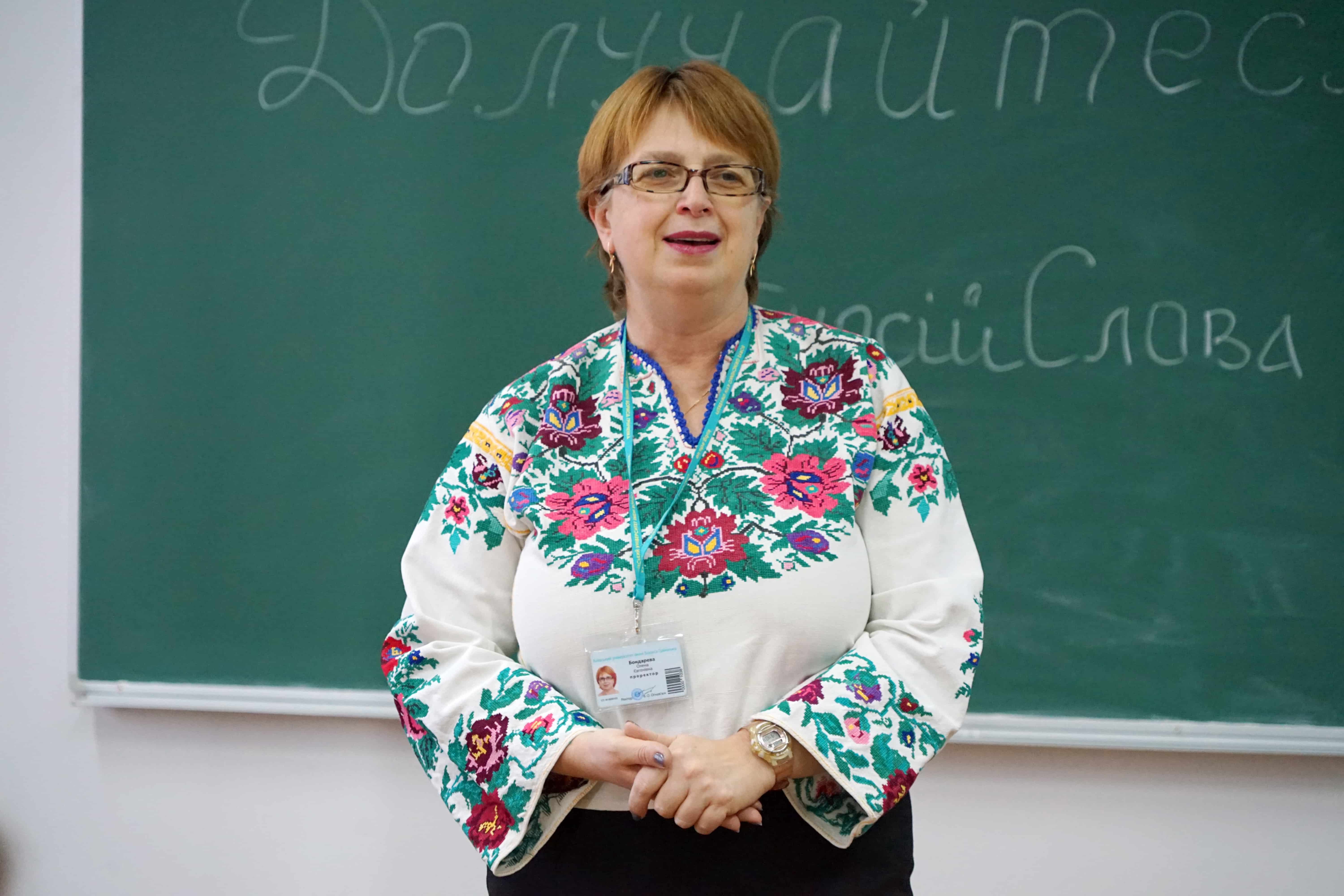 Зі зворушливим напутнім словом до всіх, хто завітам на свято української мови, звернулася проректор з науково-методичної, соціально-гуманітарної роботи та лідерства Університету Грінченка, доктор філологічних наук Олена Євгенівна Бондарева. А додала рішучості на шляху до перемоги у мовних змаганнях натхненна пісня у виконанні студентки Інституту філології, переможниці Всеукраїнської музичної олімпіади «Голос Країни» XIV Регіни Пилипенко.