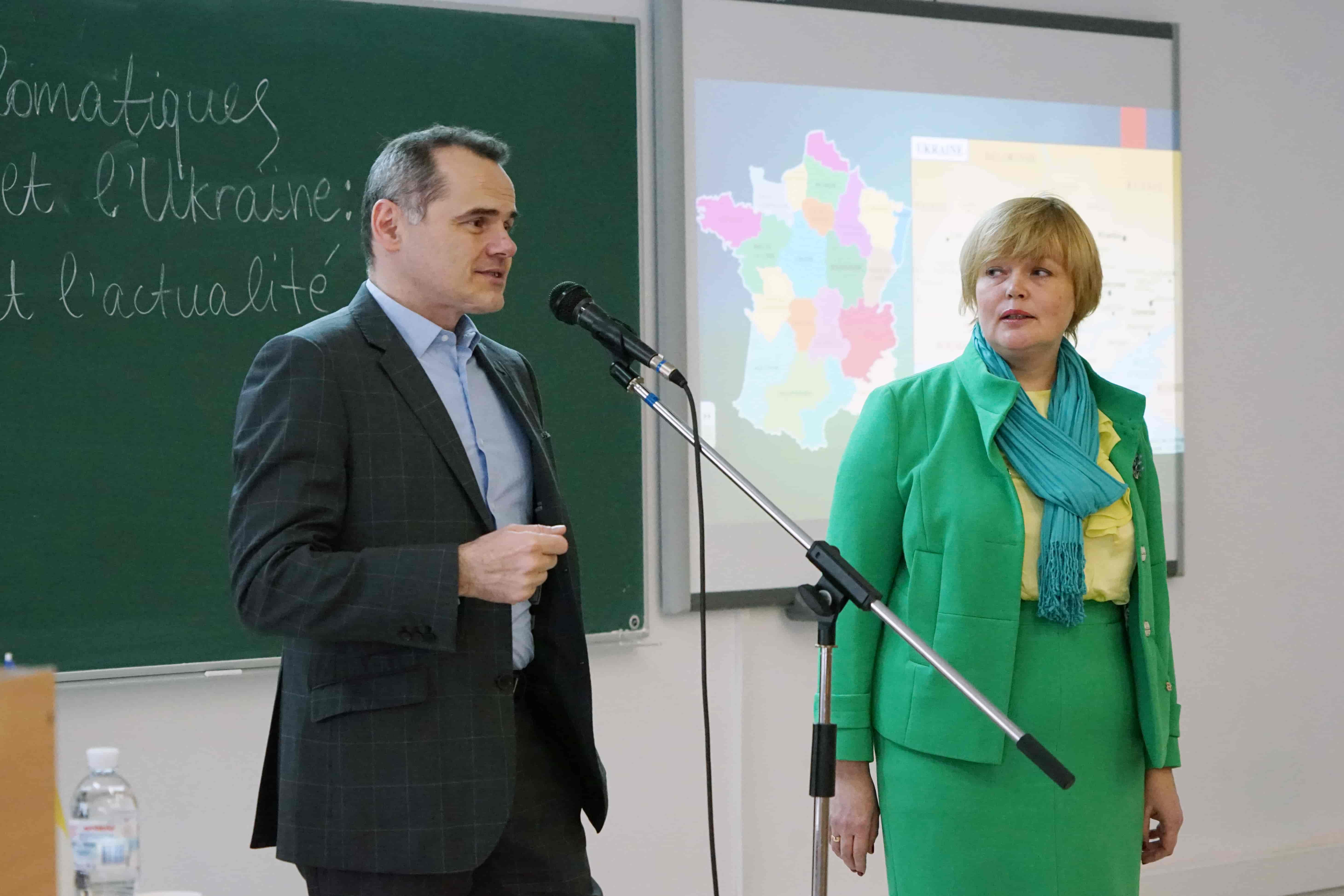 З вітальним словом до учасників заходу звернулася директор Інституту філології Ірина Євгеніївна Руснак. Студенти Інституту філології і Факультету права та міжнародних відносин мали нагоду обговорити з представником амбасади Франції як стратегічні питання співпраці Франції та України, так і особливості роботи й організації дозвілля представника дипломатичного корпусу. Гарний настрій створили кумедні історії і доречні анекдоти. Не оминули увагою й мовне питання, а пан ле Ріголер вразив присутніх рівнем володіння українською.