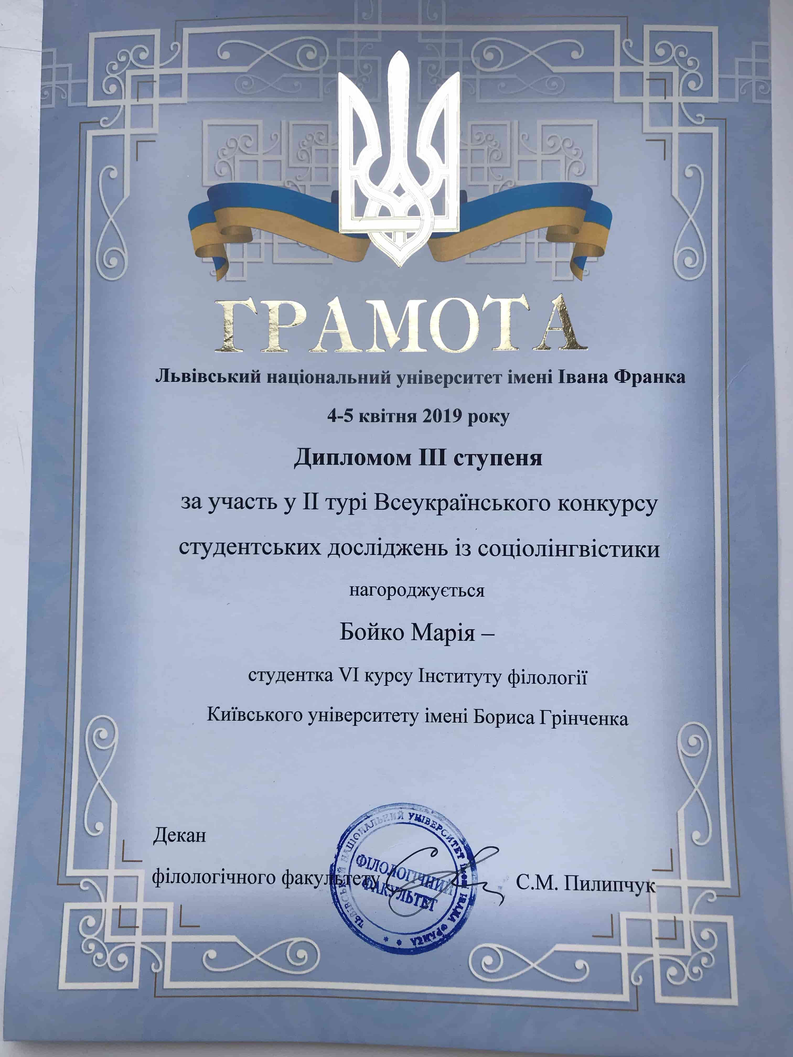 За результатами Підсумкової науково-практичної конференції диплом ІІІ ступеня отримала Марія Іванівна Бойко, студентка VI курсу спеціальності «Українська мова та література» Інституту філології.