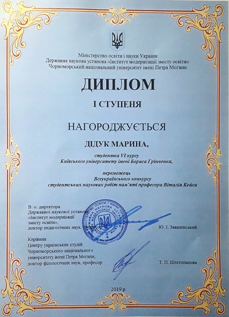 За результатами оцінювання конкурсного журі диплом І ступеня здобула Дідук Марина Олександрівна, студентка VІ курсу спеціальності «Філологія (українська мова і література)» Інституту філології Київського університету імені Бориса Грінченка (дослідження «Проблема збереження національної ідентичності у творчості Павла Маляра періоду еміграції»). Вітаємо переможницю та її наукового керівника Бровко Олену Олександрівну, завідувача кафедри української літератури і компаративістики Інституту філології, доктора філологічних наук, професора.