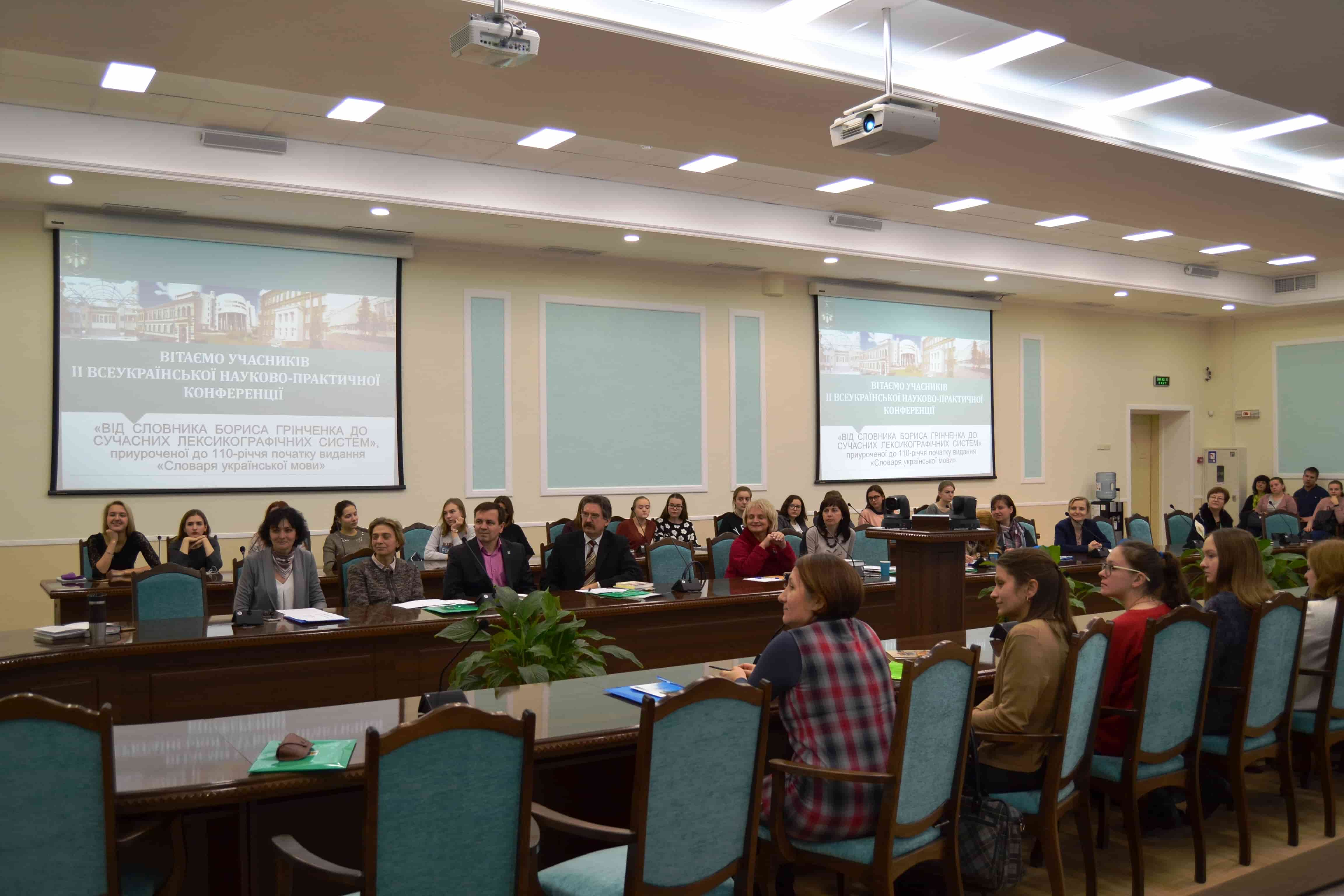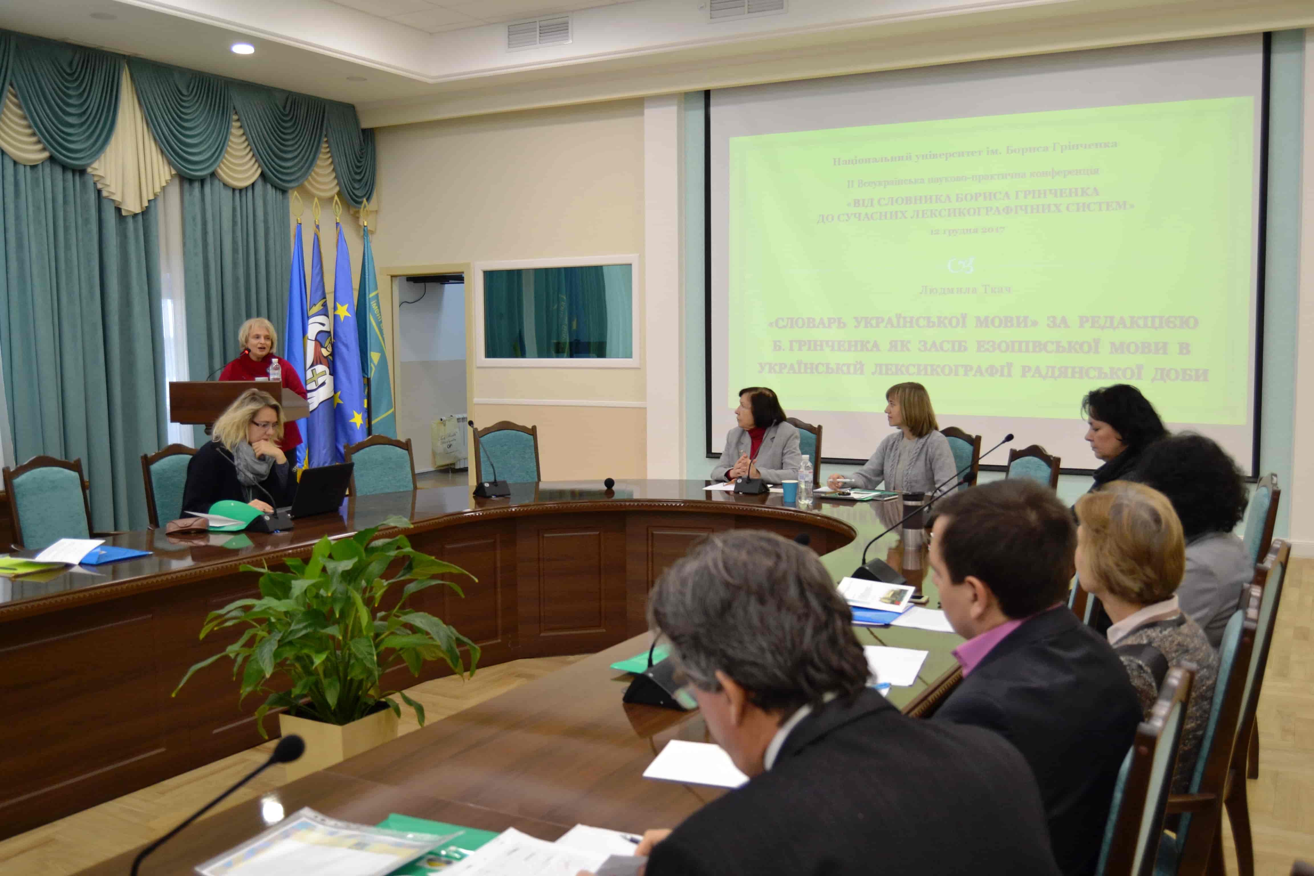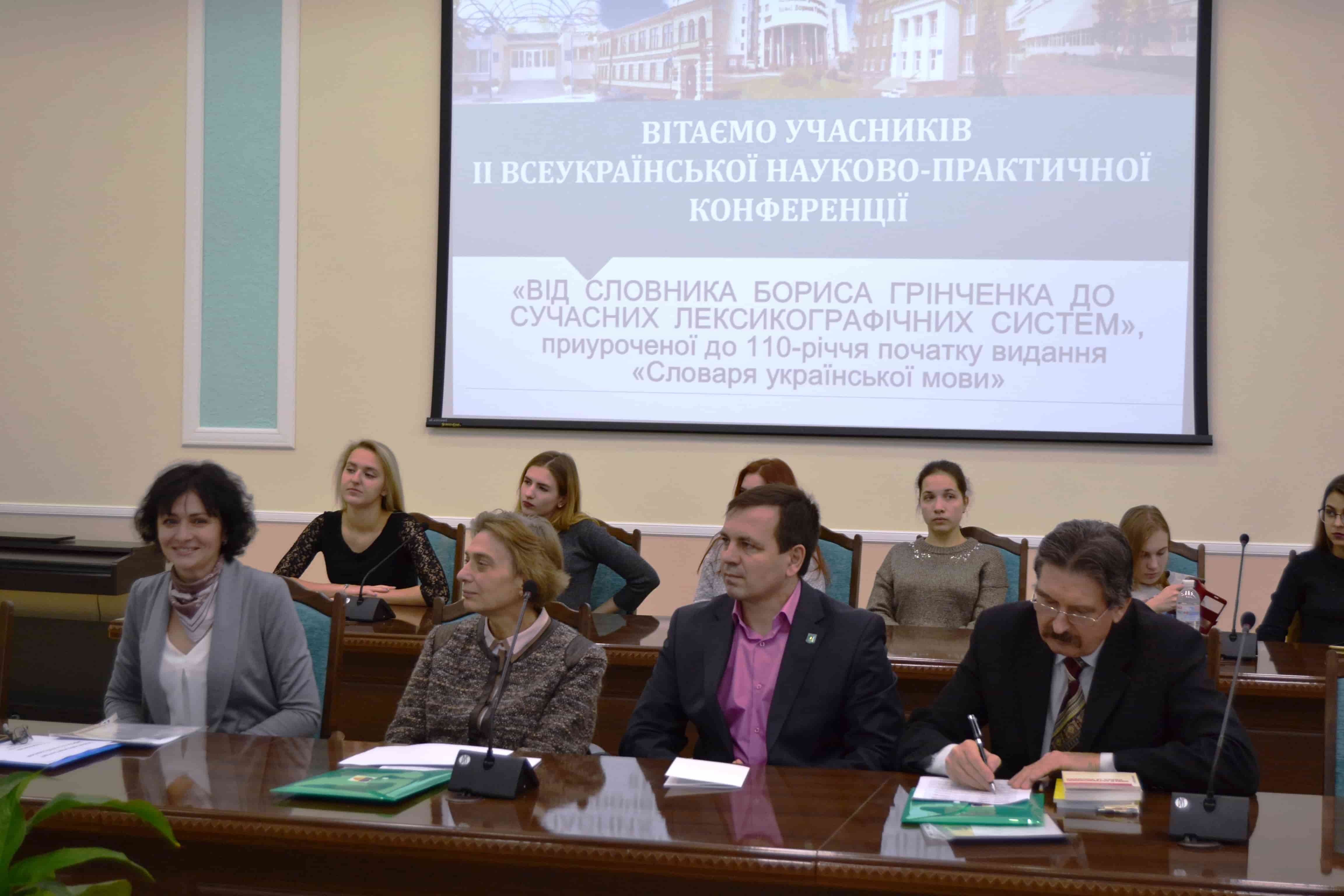 12 грудня 2017 року в Інституті філології відбулася ІІ Всеукраїнська науково- практична конференція «Від словника Бориса Грінченка до сучасних лексикографічних систем», приурочена до 110-річчя початку видання «Словаря української мови». Уже традиційно модерувала захід доктор філологічних наук почесний професор Київського університету імені Бориса Грінченка, професор кафедри української мови Національного університету «Києво-Могилянська академія», провідний науковий співробітник Інституту української мови НАН України Лариса Терентіївна Масенко. Під час конференції з доповідями виступили провідні лексикографи України: доктор філологічних наук завідувач відділу лексикології, лексикографії та структурно-математичної лінгвістики Інститут української мови НАН України Євгенія Анатоліївна Карпіловська; доктор філологічних наук професор кафедри сучасної української мови філологічного факультету Чернівецького національного університету імені Юрія Федьковича Людмила Олександрівна Ткач; кандидат філологічних наук старший науковий співробітник відділу лексикології, лексикографії та структурно-математичної лінгвістики Інституту української мови НАН України Тищенко Оксана Миколаївна; кандидат філологічних наук доцент кафедри сучасної української мови філологічного факультету Чернівецького національного університету імені Юрія Федьковича