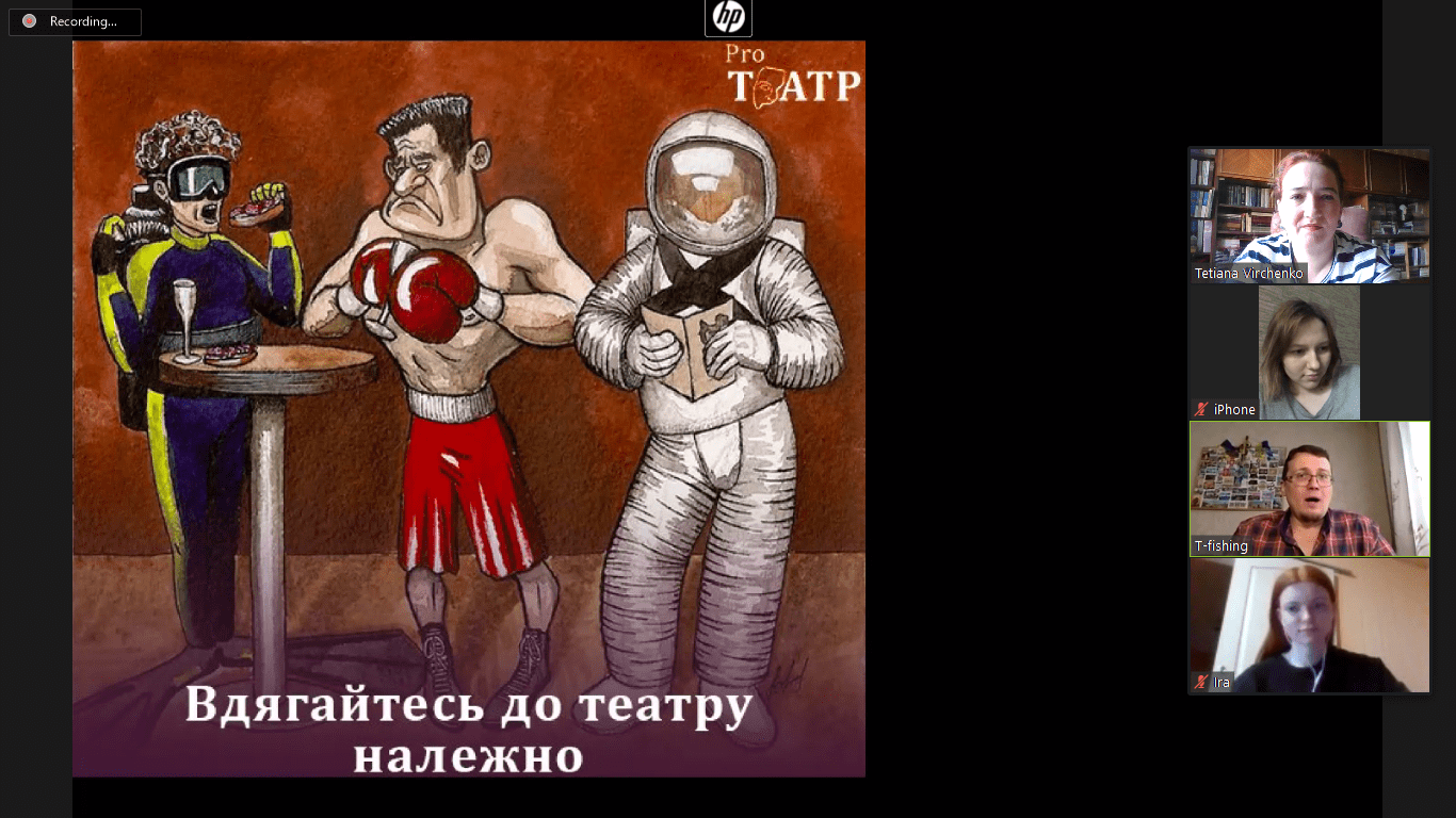 Чи ходимо ми в театр за інерцією? Чи є вистава продуктом для споживання? Чому сьогодні багато вистав за п’єсами В. Шекспіра? Що втрачає чи здобуває вистава мінімумом реквізиту? Чи сценічний текст сьогодні закритий для імпровізації? Ці та інші питання були предметом розмови в перший вечір 12 березня. Ми переконалися, що якість трансльованого тексту залежить від ефективності встановленого контакту між сценою і залою, а вистава стає виставою тоді, коли відбувається акт споглядання