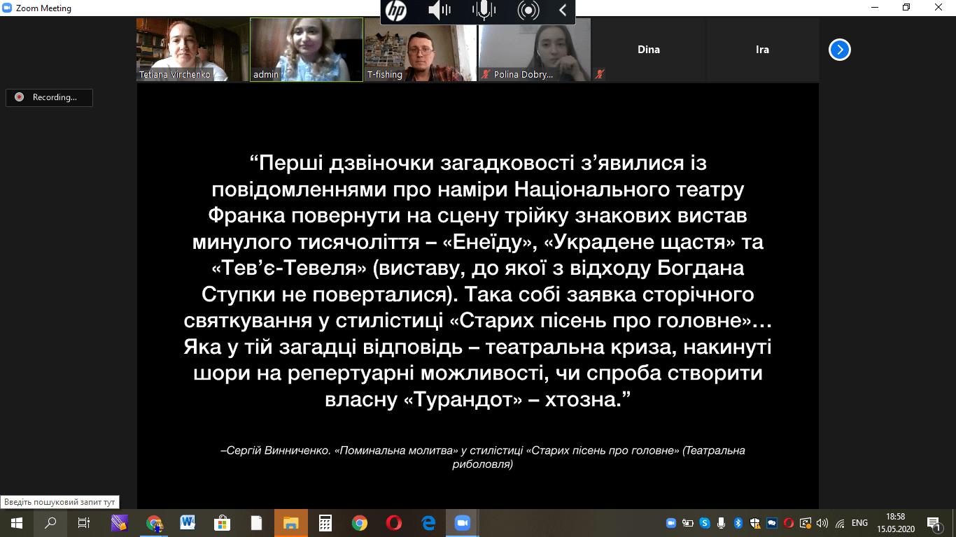Дні науки – прекрасний час для пошуку істини. Саме тому магістри освітньо-професійної програми «Літературна творчість» долучились до дискусії з театральним блогером, автором і ведучим порталу «Театральна риболовля» Сергієм Винниченком. Розмова про театральні комунікації перетворилась на виставу на чотири дії: Вистава, Театральний колектив, Глядач, Блогер. (Організатор зустрічі – гарант ОП «Літературна творчість» Тетяна Вірченко). Успішно модерували захід магістри Олександра Єременко і Вікторія Лось, Поліна Лівшиць і Дар’я Даценко, Марина Кухтик та Ірина Стасюк, Поліна Добридень і Діна Мансурова.