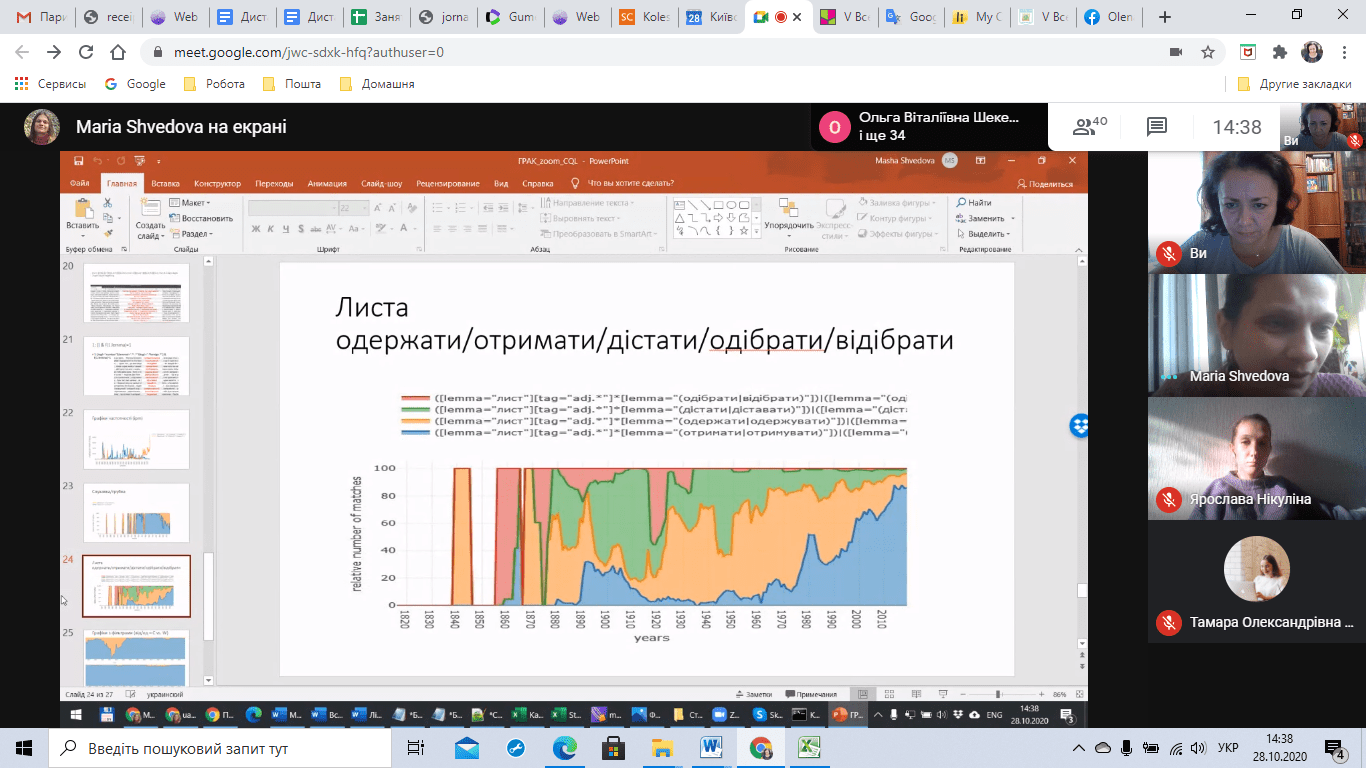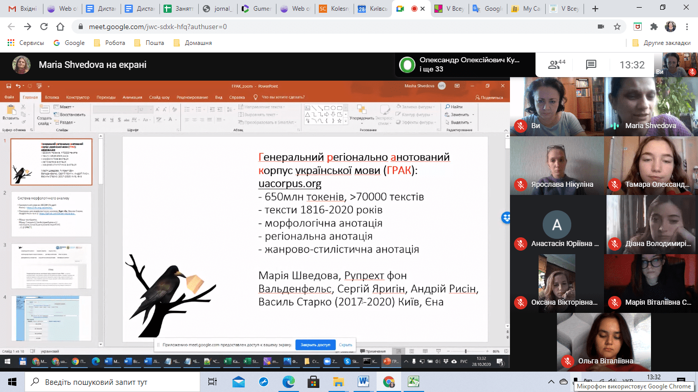 Але 28 жовтня 2020 року під час гостьової онлайн-лекції кандидат філологічних наук, доцент Марія Олексіївна Шведова розповіла про корпус як інструмент, необхідний сучаному лінгвістові. Говорили про розмітку текстів і можливості пошукової системи корпусу, вплив суспільно-політичних чинників на функціонування мови і омоформи в конкордансах. Проте багато питань залишилися поза увагою учасників зібрання через хронометраж лекції. Тож є ще про що погорити, з чим попрацювати!