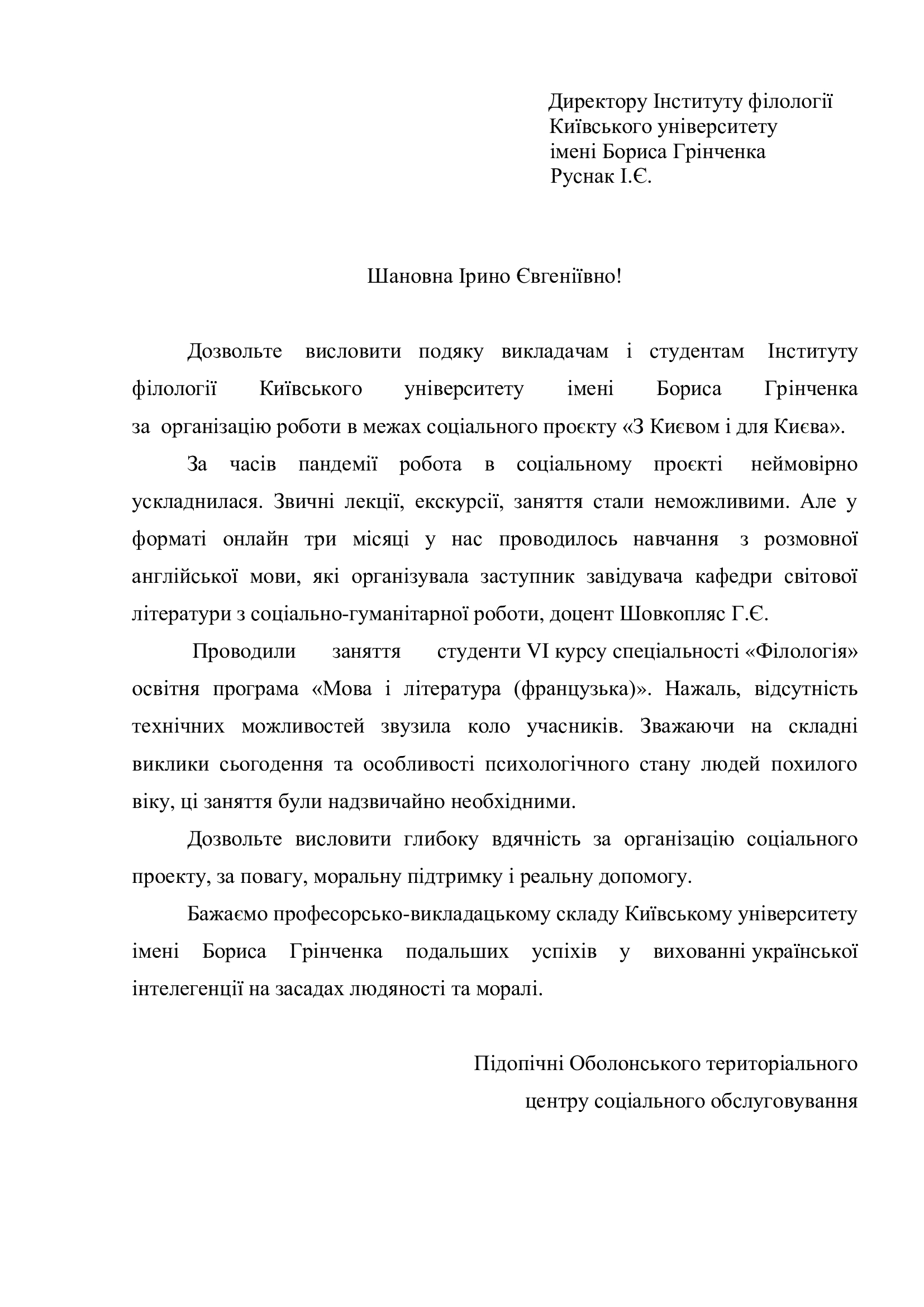 Подяка від Оболонського територіального центру соціального обслуговування Інституту філології за організацію роботи в межах соціального проєкту "З Києвом і для Києва"