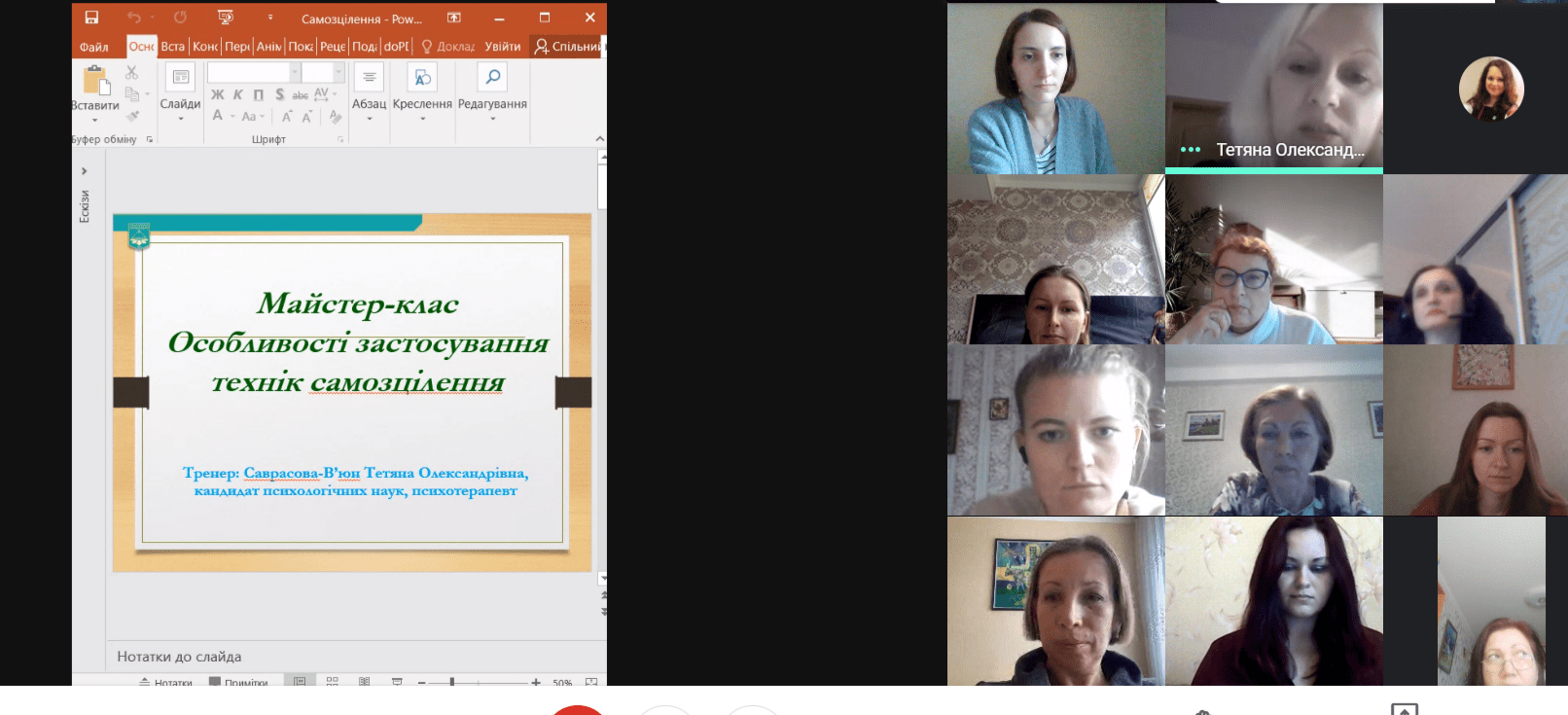 - «Особливості застосування технік самозцілення» (тренер Т. Саврасова-В’юн).