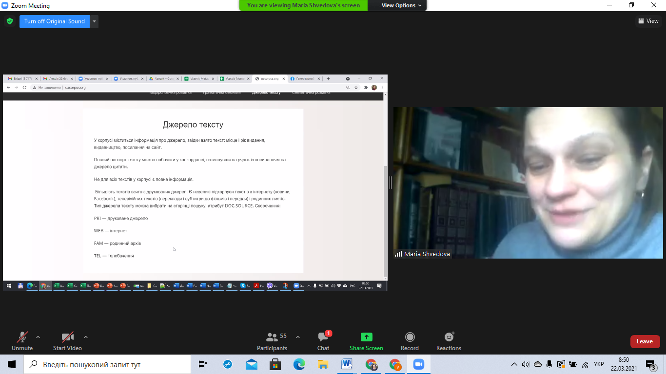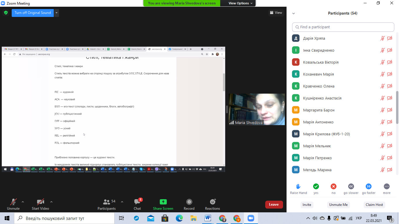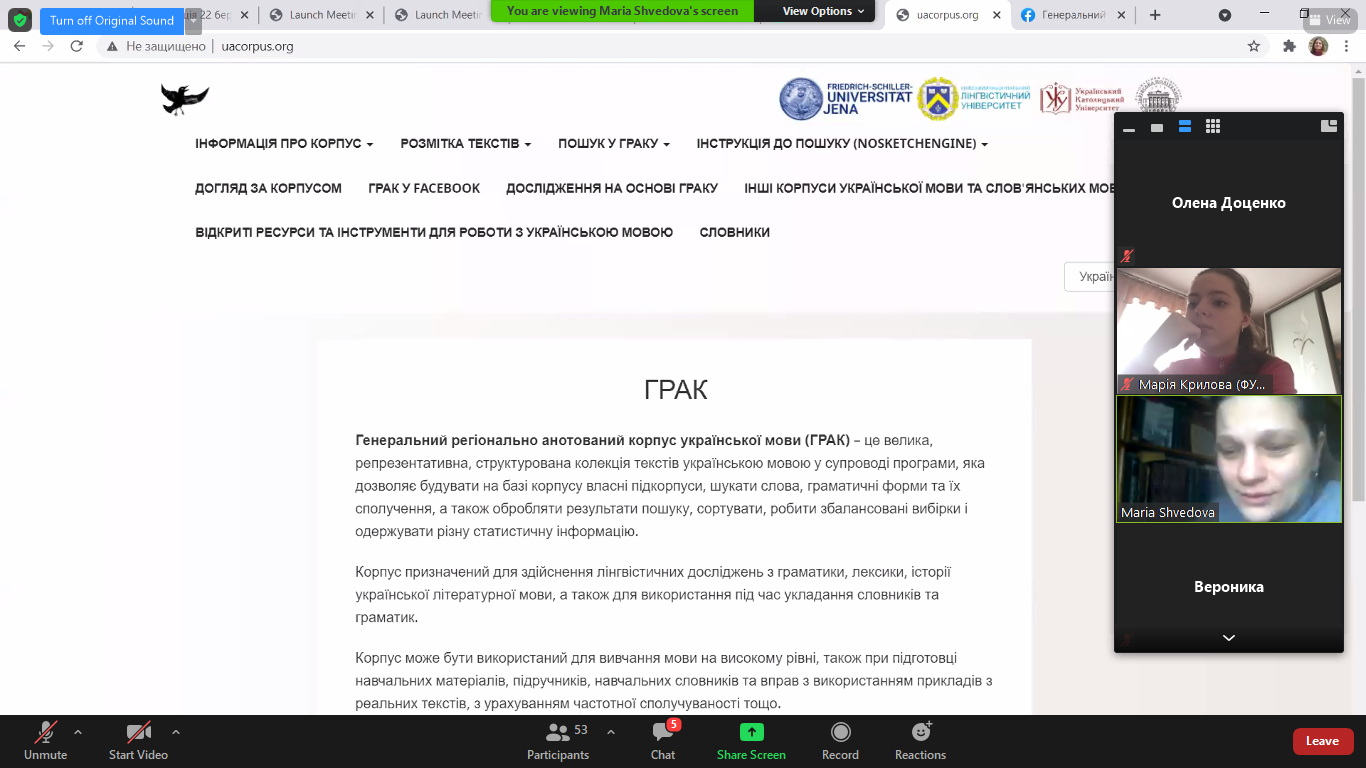 22 березня 2021 року відбулася зустріч студентів-україністів І курсу Інституту філології з розробницею Генерального регіонально анотованого корпусу української мови (ГРАК) кандидатом філологічних наук, доцентом Шведовою Марією Олексіївною. Студенти познайомилися з можливостями корпусу, навчилися користуватися різними видами пошуку мовної інформації, підготувалися до наповнення корпусу в межах практики з прикладної лінгвістики.