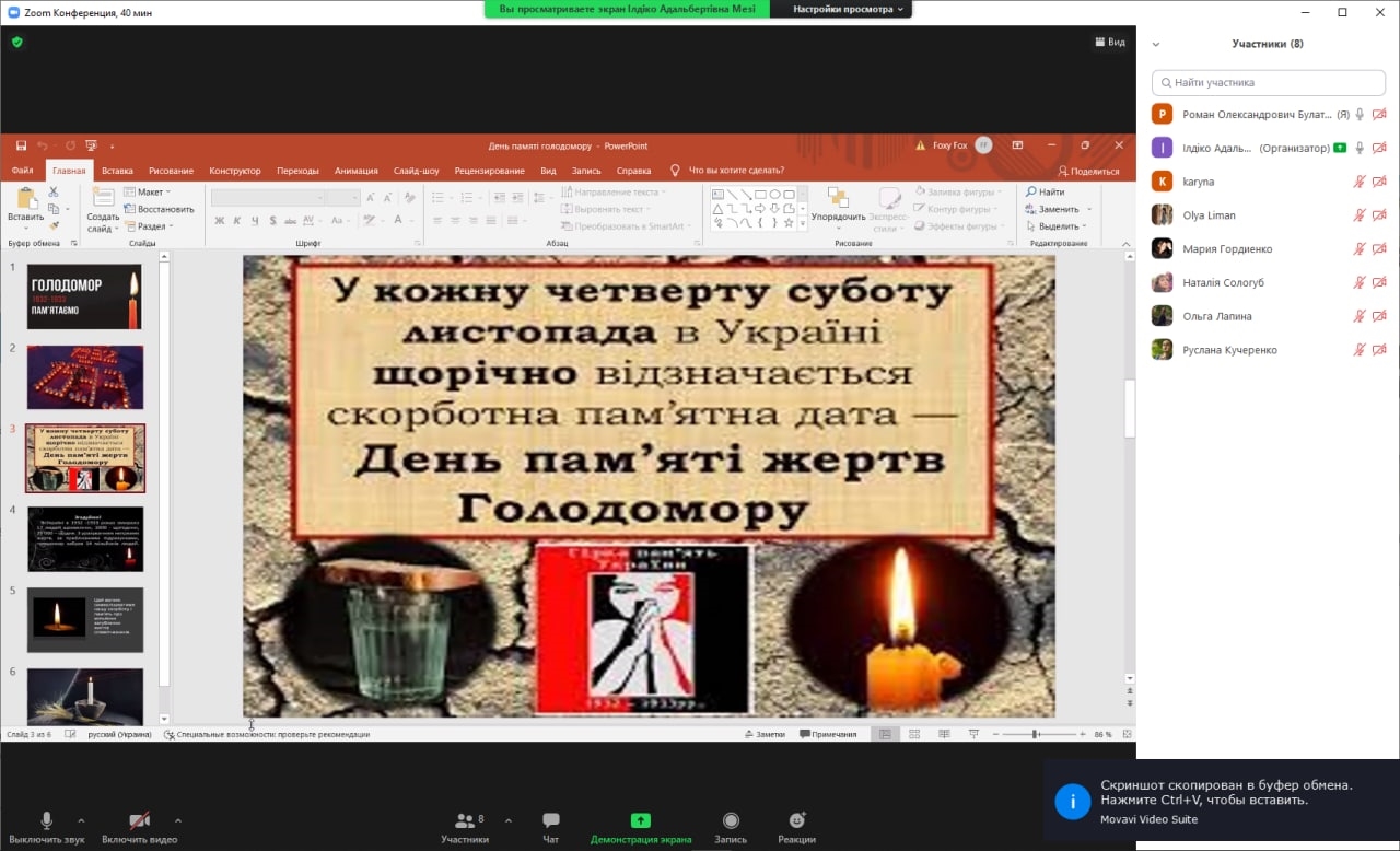 Вшановуючи пам’ять жертв Голодомору в Україні, викладачі та студенти Інституту філології Київського університету імені Бориса Грінченка провели кураторські години «І пам’яті свічка не згасне» (модератори – куратори студентських груп); переглянули художній фільм «Ціна правди» (модератор – Бойко М.І., кафедра української мови); долучилися до аналізу документального фільму «Жорна» (модератор – Лахно Н. В., кафедра української мови); здійснили віртуальну екскурсію до музею Голодомору (модератори – Блохіна Н.О., Башкирова О.М., Євтушенко С.О., кафедра української літератури, компаративістики і грінченкознавства).