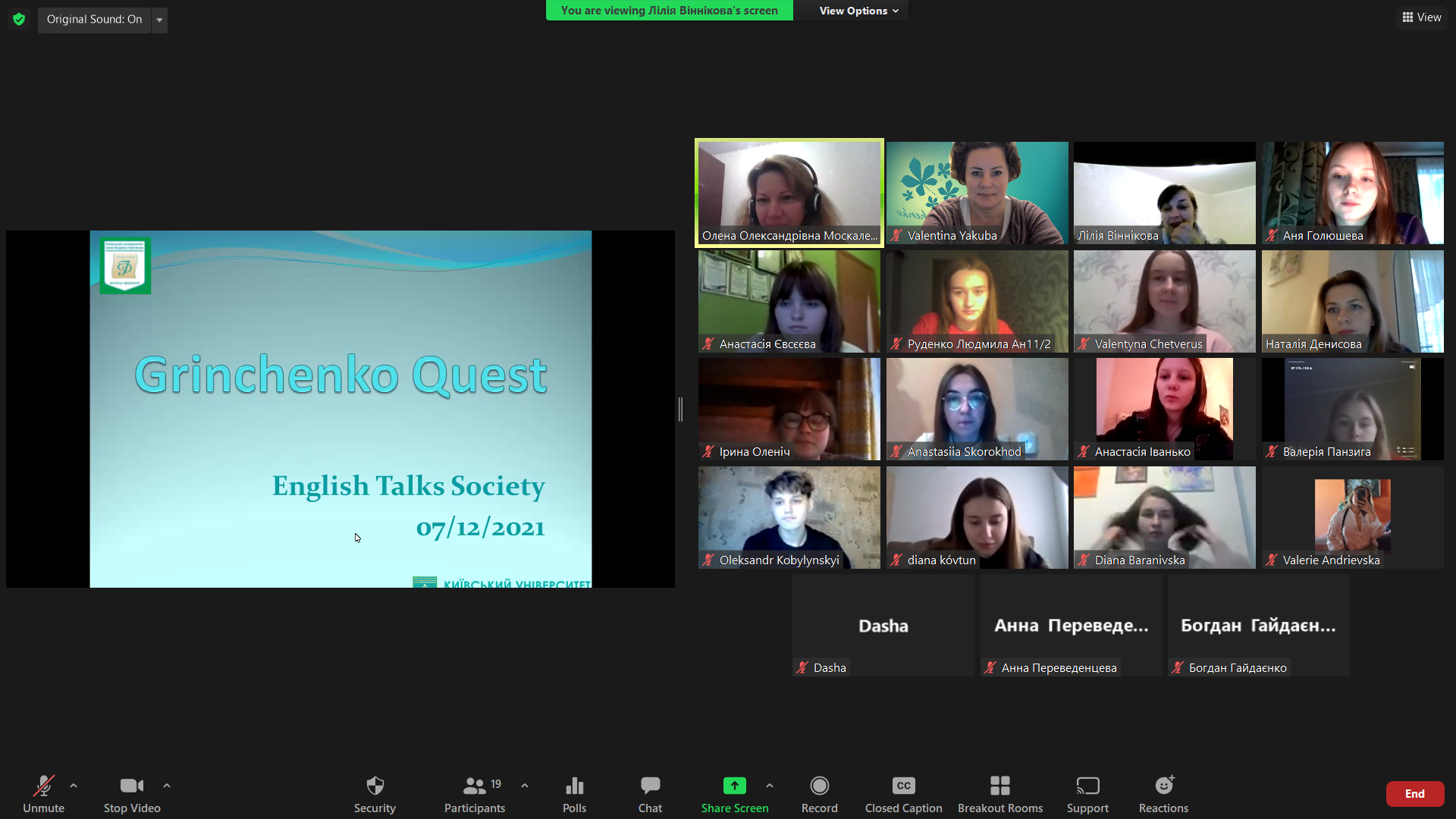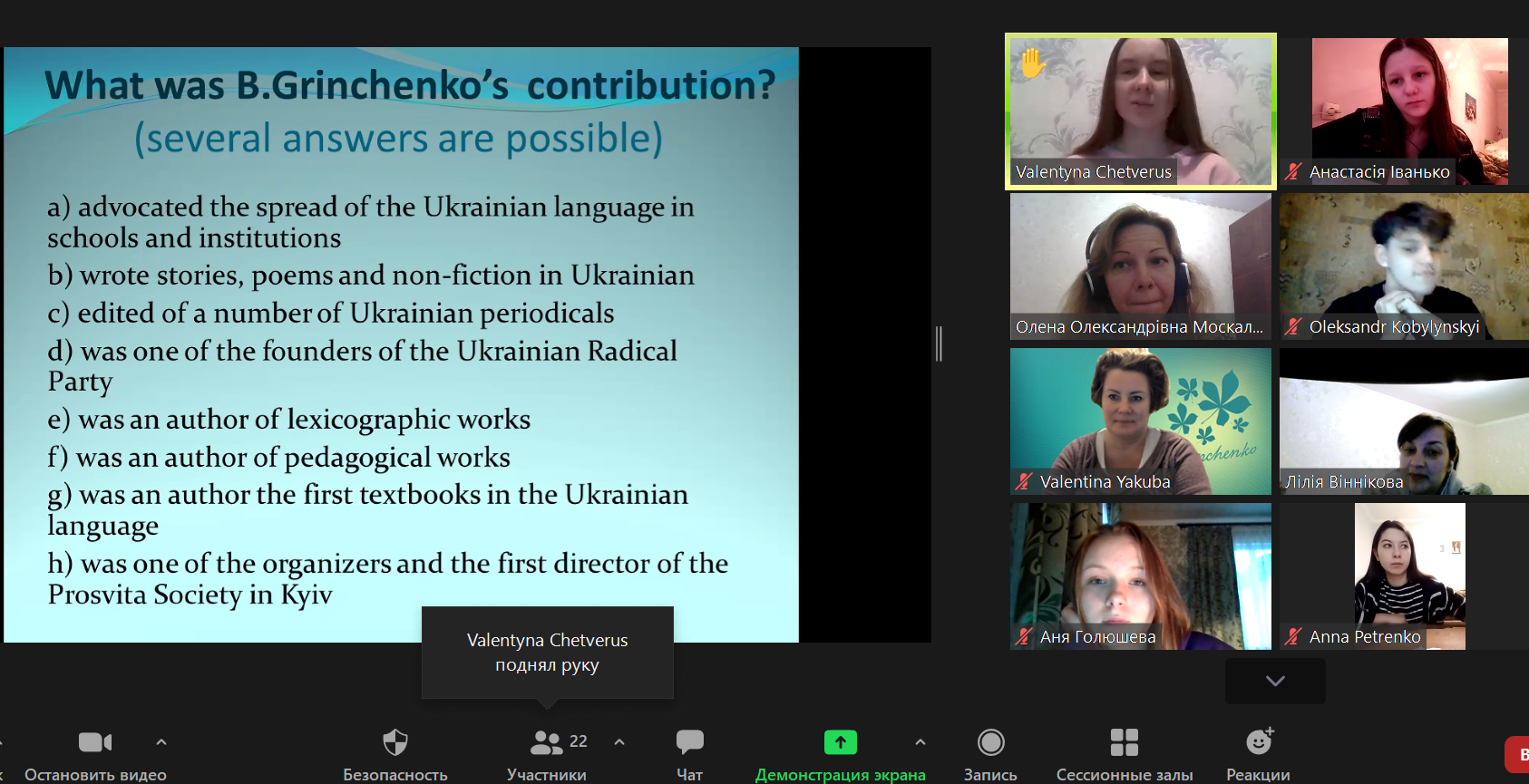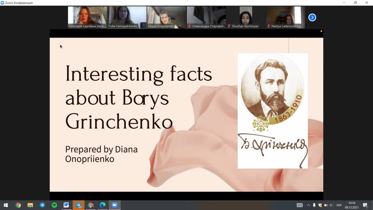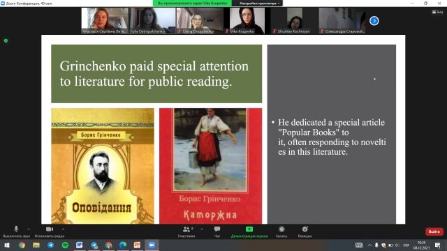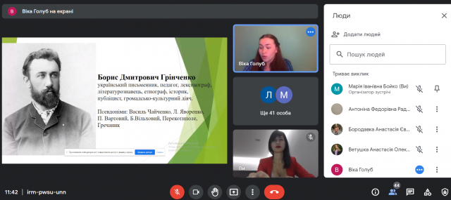 - інтерактивна лекція-бесіда «Видавнича та просвітницька діяльність родини Грінченків на тлі доби» (модератор – Яковлева І.В., молодший науковий співробітник кафедри української літератури, компаративістики і грінченкознавства);