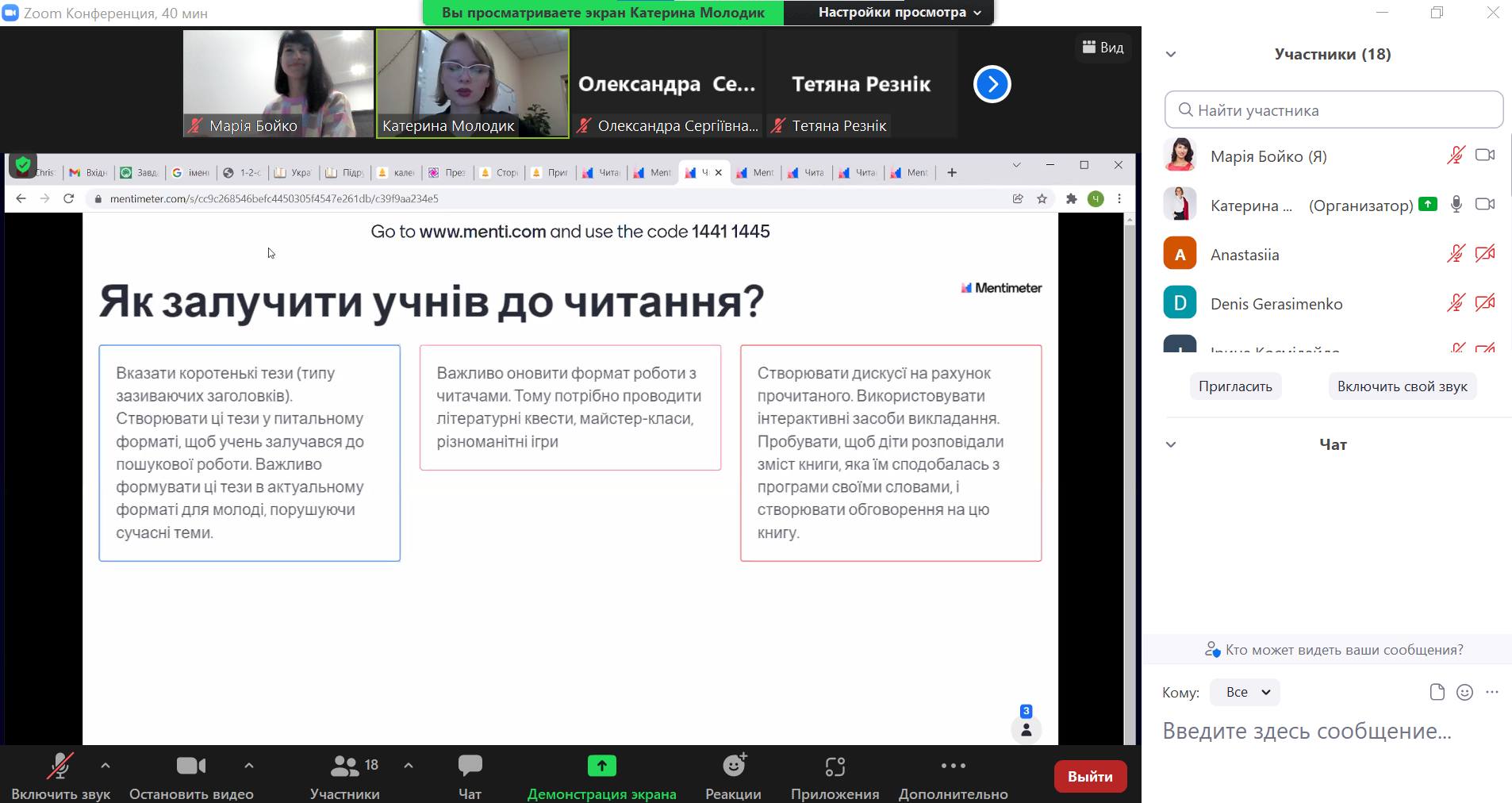 - онлайн майстер-клас «Упровадження медіаосвіти на уроках української мови» (Молодик К.Ю., переможниця Всеукраїнського конкурсу «Учитель року – 2021», Бойко М.І., викладач кафедри української мови);