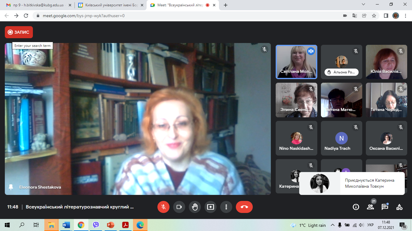 - онлайн Всеукраїнський літературознавчий круглий стіл із міжнародною участю «Автор і твір крізь призму ідентичності у світовій літературі: 1821 – 1921 – 2021» (модератори – Тверітінова Т.І., доцент кафедри світової літератури, Шовкопляс Г.Є., доцент кафедри світової літератури);