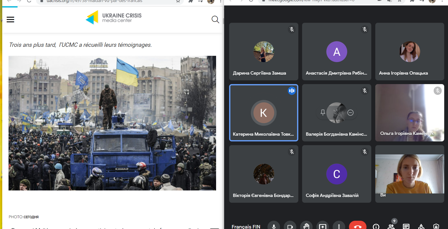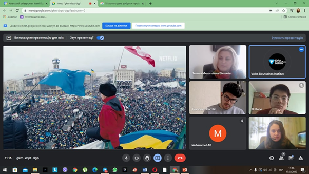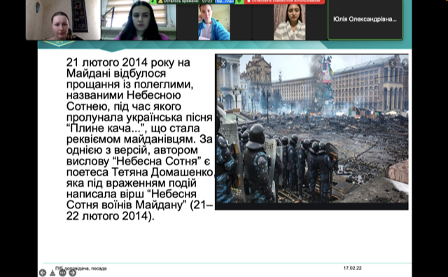 - онлайн-заняття «Революція гідності очима іноземців. Сприйняття іноземцями нашої історії. Герої Небесної Сотні. Герой України Василь Сліпак» (модератори – Т. М. Вінтонів, Т.О. Горохова, кафедра української мови);