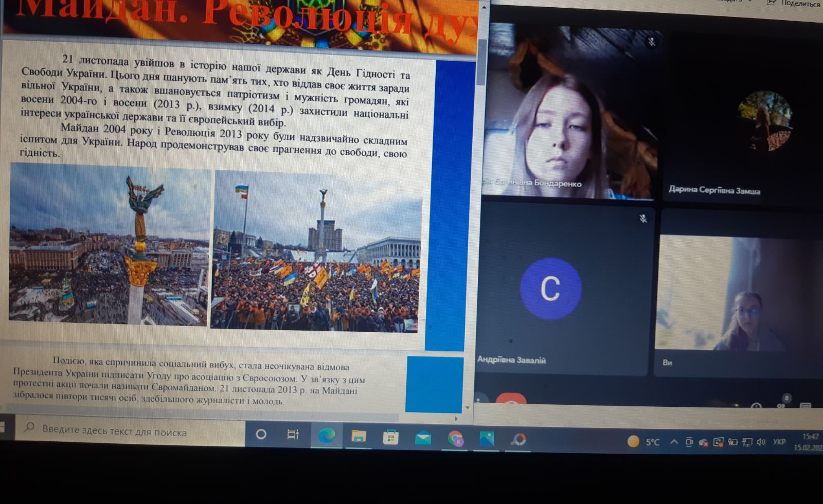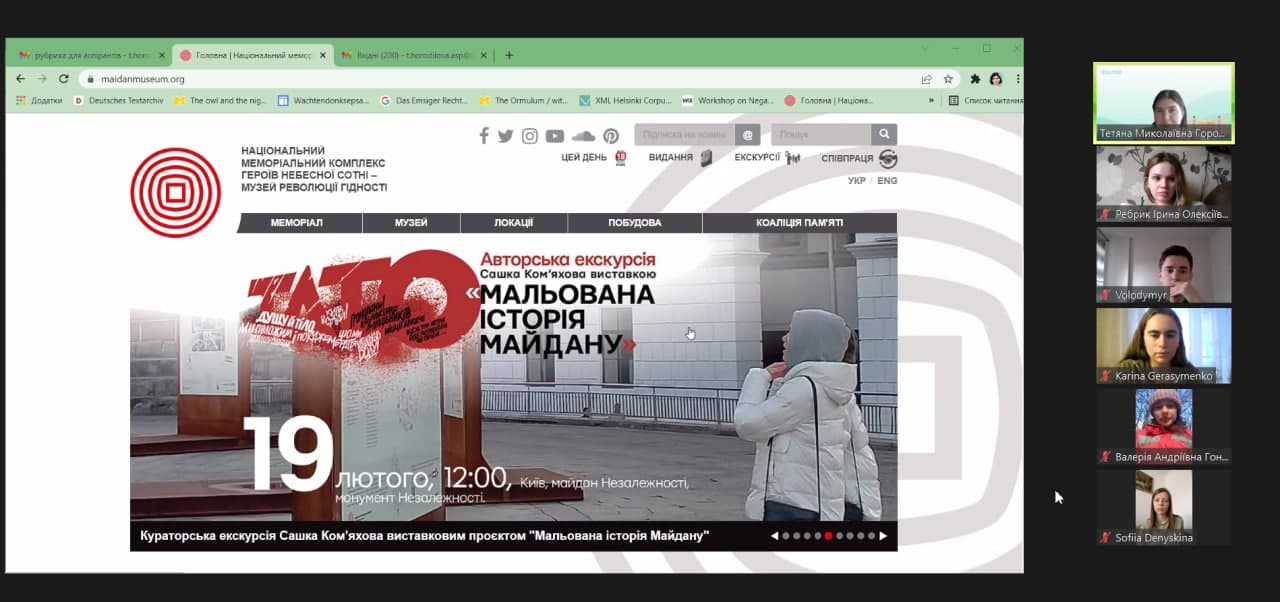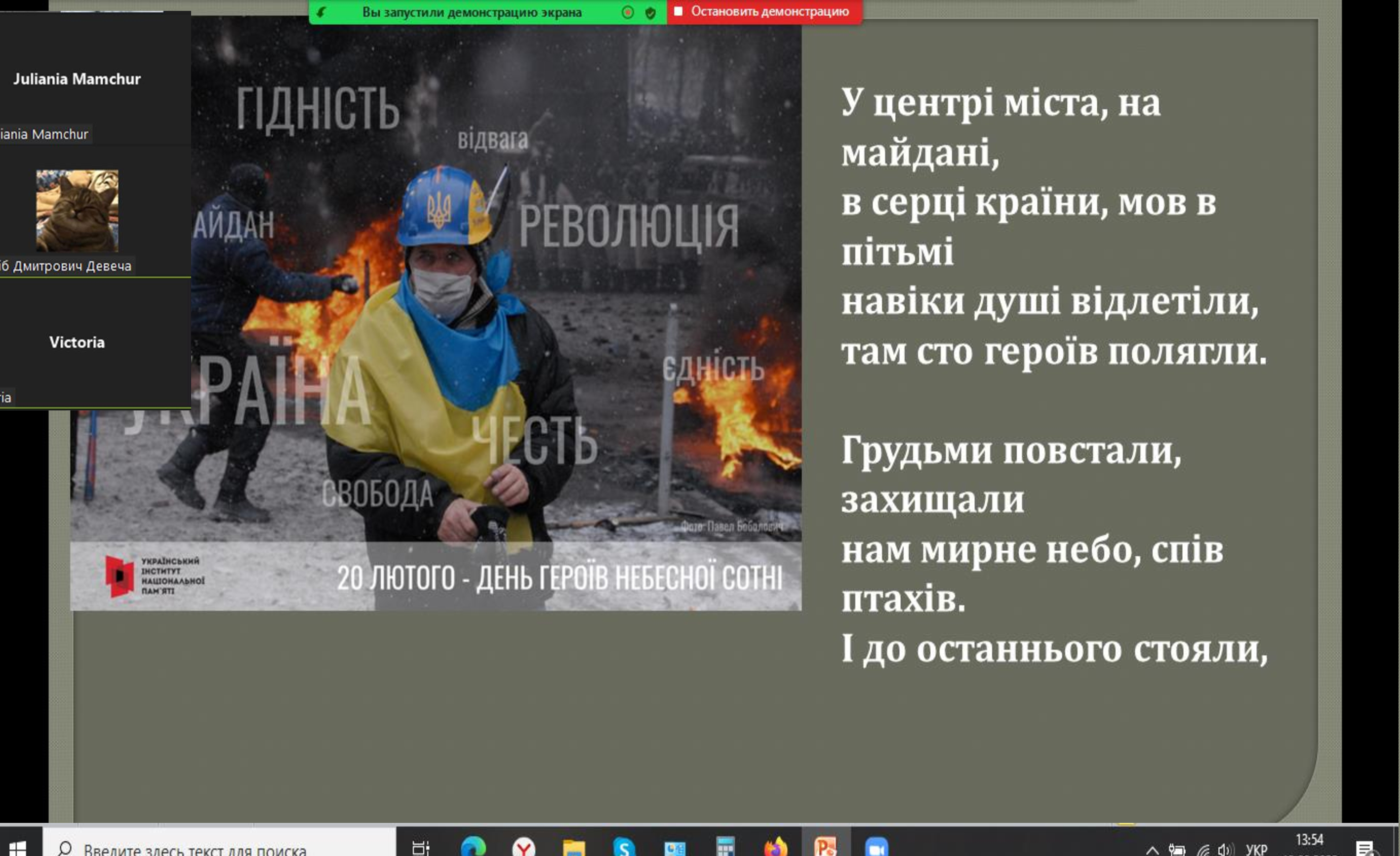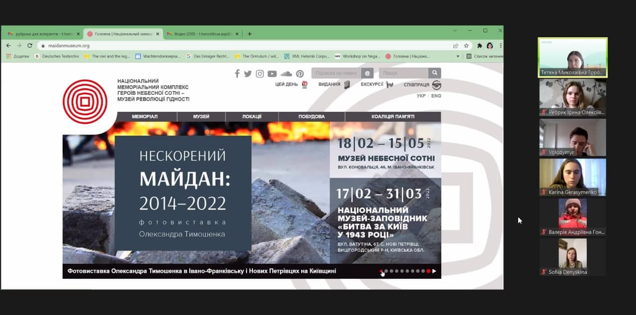 - онлайн-зустрічі з адвокаткою Євгенією Закревською «День пам’яті Героїв Небесної Сотні» (модератор – Ю.В. Вишницька, кафедра світової літератури).