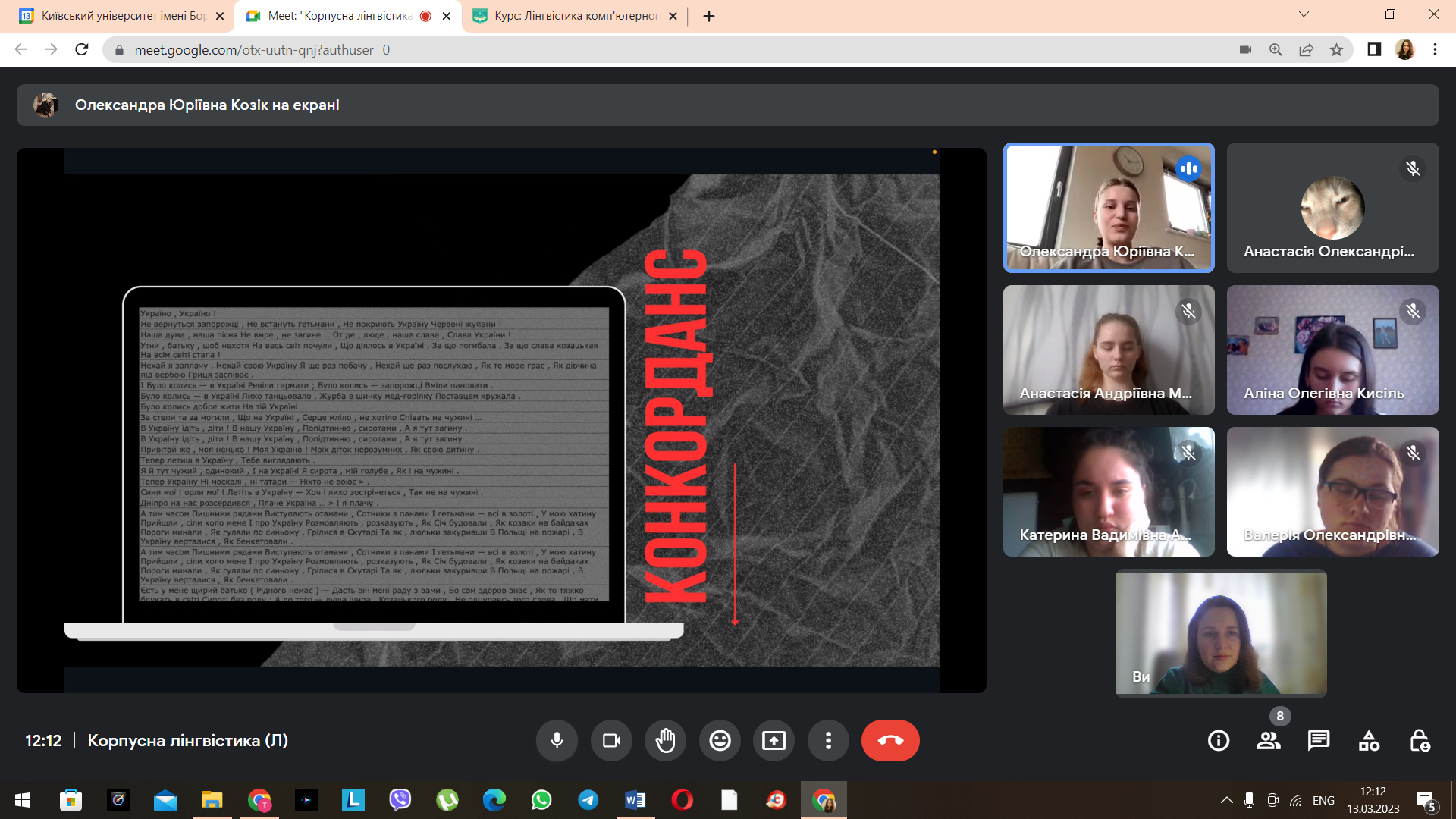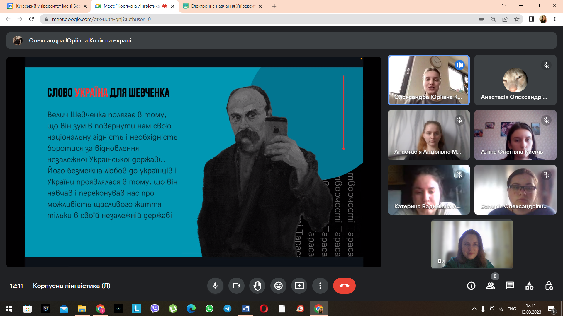 13 березня 2023 року студенти 2-го курсу Факультету української філології, культури і мистецтва Університету Грінченка вшанували пам'ять Тараса Шевченка в межах вивчення курсу «Корпусна лінгвістика» (викладач – канд. пед. наук, старший викладач Т.О. Горохова) і презентували проєкти «Корпусні технології у вивченні творчості Тараса Шевченка». Студенти проаналізували можливості корпусів текстів у реалізації лінгвістичних і літературознавчих досліджень творчого доробку Поета, а також визначили лінгводидактичний потенціал використання корпусів на уроках у закладах загальної середньої освіти.