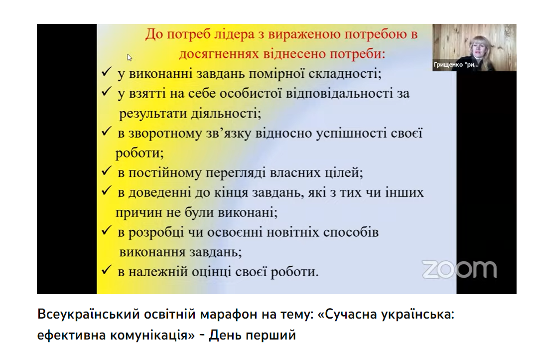Сьогодні науковцями засвідчено, що соціум потребує людей, здатних досягати результату, тобто сильних особистостей, мотивованих на успіх. У межах тренінгу «Роль лідерства у популяризації української мови» (спікер - Грищенко І.М.) учасники не лише ознайомилися з основними принципами лідерства, а й пройшли тест «Діагностики задоволеності основних потреб», розробили карту для досягнення успіхів у професійній сфері.