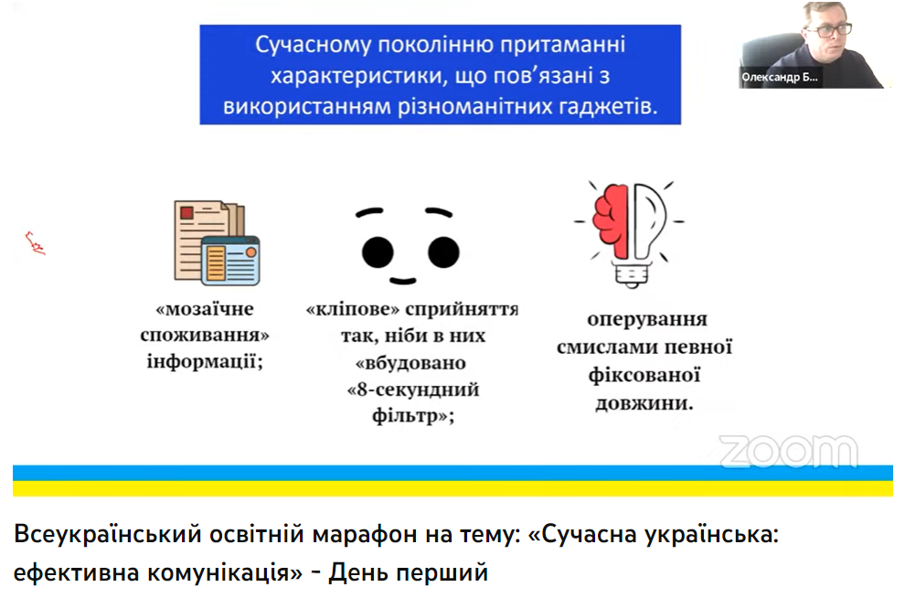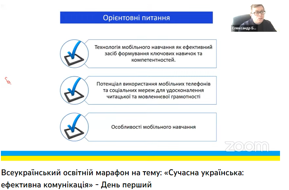 21 березня 2023 року викладачі кафедри української мови і члени Наукового товариства студентів, магістрантів, аспірантів та молодих учених Факультету української філології, культури і мистецтва долучилися до онлайнового Всеукраїнського освітнього марафону на тему: «Сучасна українська: ефективна комунікація». Організаторами семінару є Міністерство освіти і науки України, Державна наукова установа «Інститут модернізації змісту освіти», ГО «Ukraine Active».
