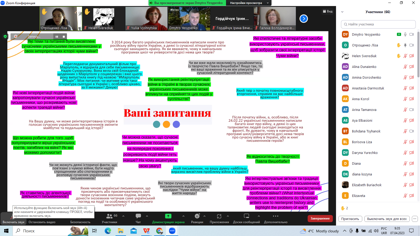 гостьову лекцію «Чума війни: Реінтерпретована історія у голосах сучасних українських письменників» (Д. Єсипенко, кандидат філологічних наук, дослідник-асистент Центру Кулів, Університету, асоційований дослідник Університету ім. Монаша, Ю. Вишницька, доктор філологічних наук, доцент кафедри світової літератури);