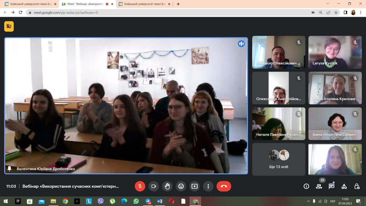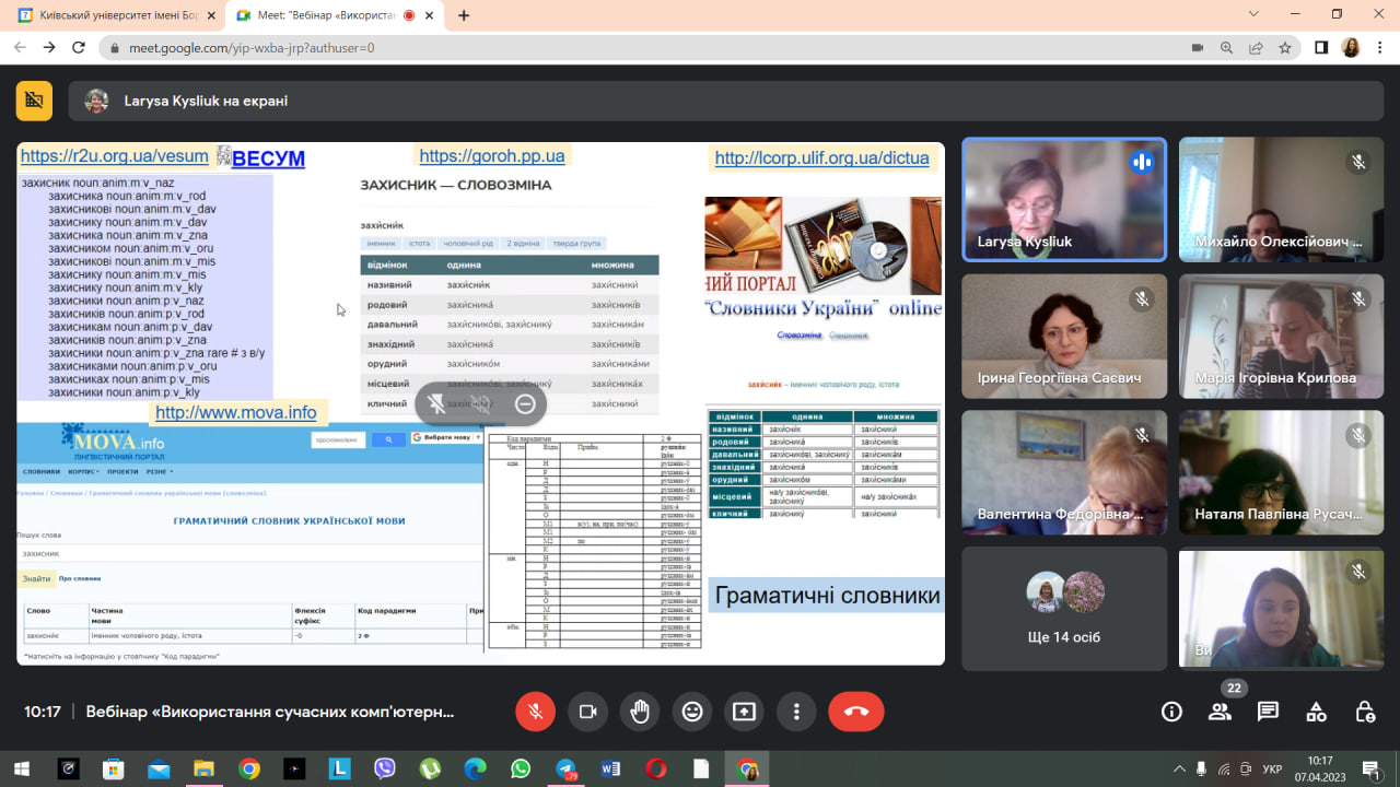 вебінар «Використання сучасних комп’ютерних технологій у вивченні української мови» (Л. Кислюк, доктор філологічних наук, старший науковий співробітник відділу лексикології, лексикографії та структурно-математичної лінгвістики Інституту української мови НАН України, М. Вінтонів, доктор філологічних наук, професор, завідувач кафедри української мови);