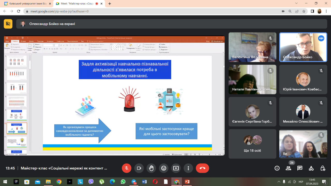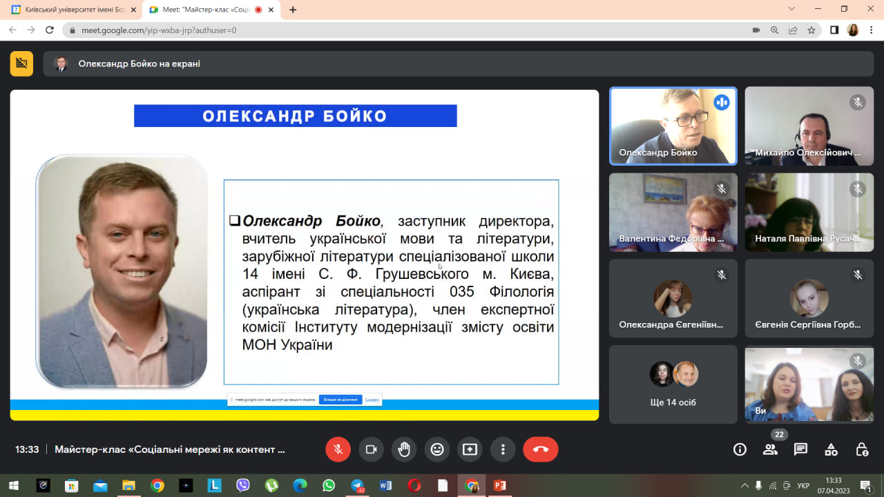майстер-клас «Соціальні мережі як контент для вдосконалення мовно-літературної компетентності» (О. Бойко, заступник директора СШ №14 ім. С.Ф. Грушевського, учитель вищої категорії, член експертної комісії з української літератури Інституту модернізації змісту освіти, М. Вінтонів, доктор філологічних наук, професор, завідувач кафедри української мови);