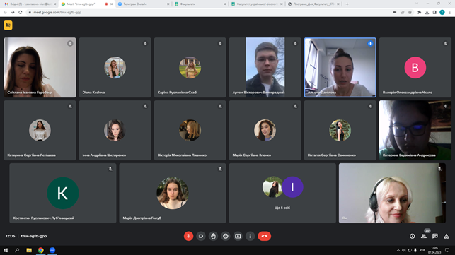 гостьову лекцію «Мігранти війни з України в Німеччину: соціальний контекст та мовна поведінка» (Н. Кісс, кандидат філологічних наук, науковий співробітник Інституту славістики Гіссенського університету імені Юстуса Лібіха, Ю.Вишницька, доктор філологічних наук, доцент кафедри світової літератури);