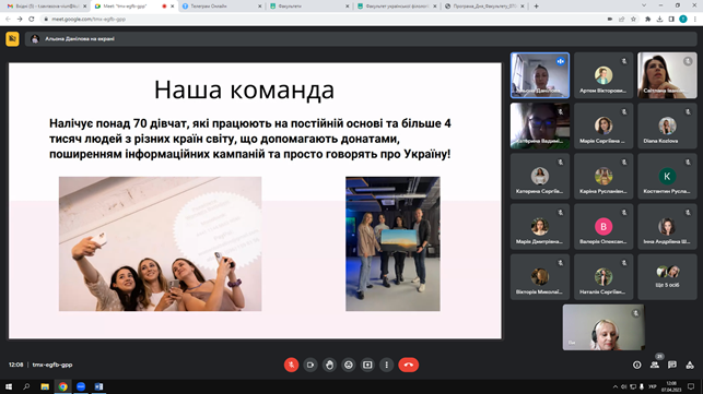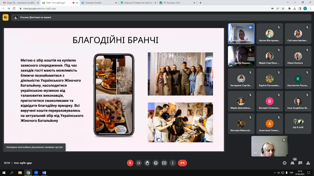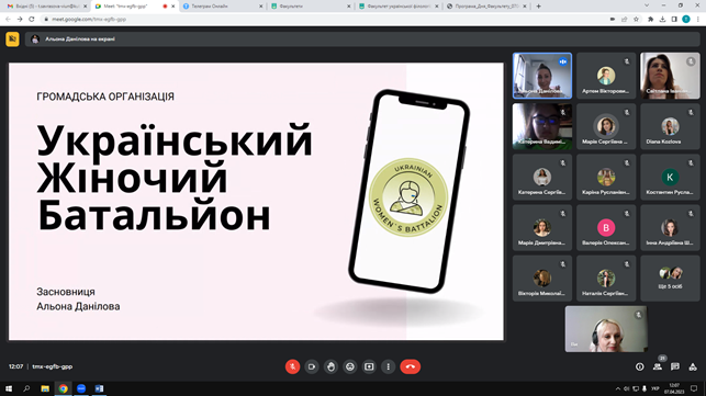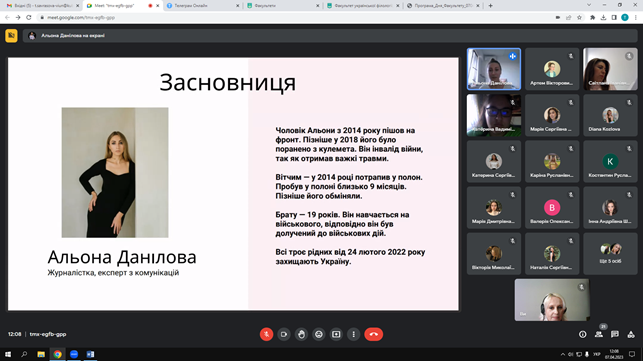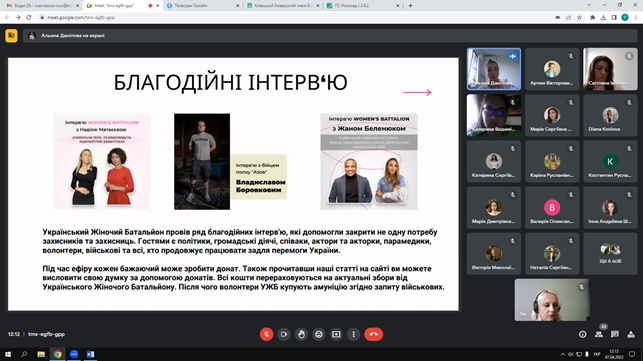 вебінар «Волонтерство, комунікації під час війни» (А. Данілова, голова ГО «Український Жіночий Батальйон», Т. Саврасова-В’юн, кандидат психологічних наук, доцент кафедри української літератури, компаративістики і грінченкознавства);
