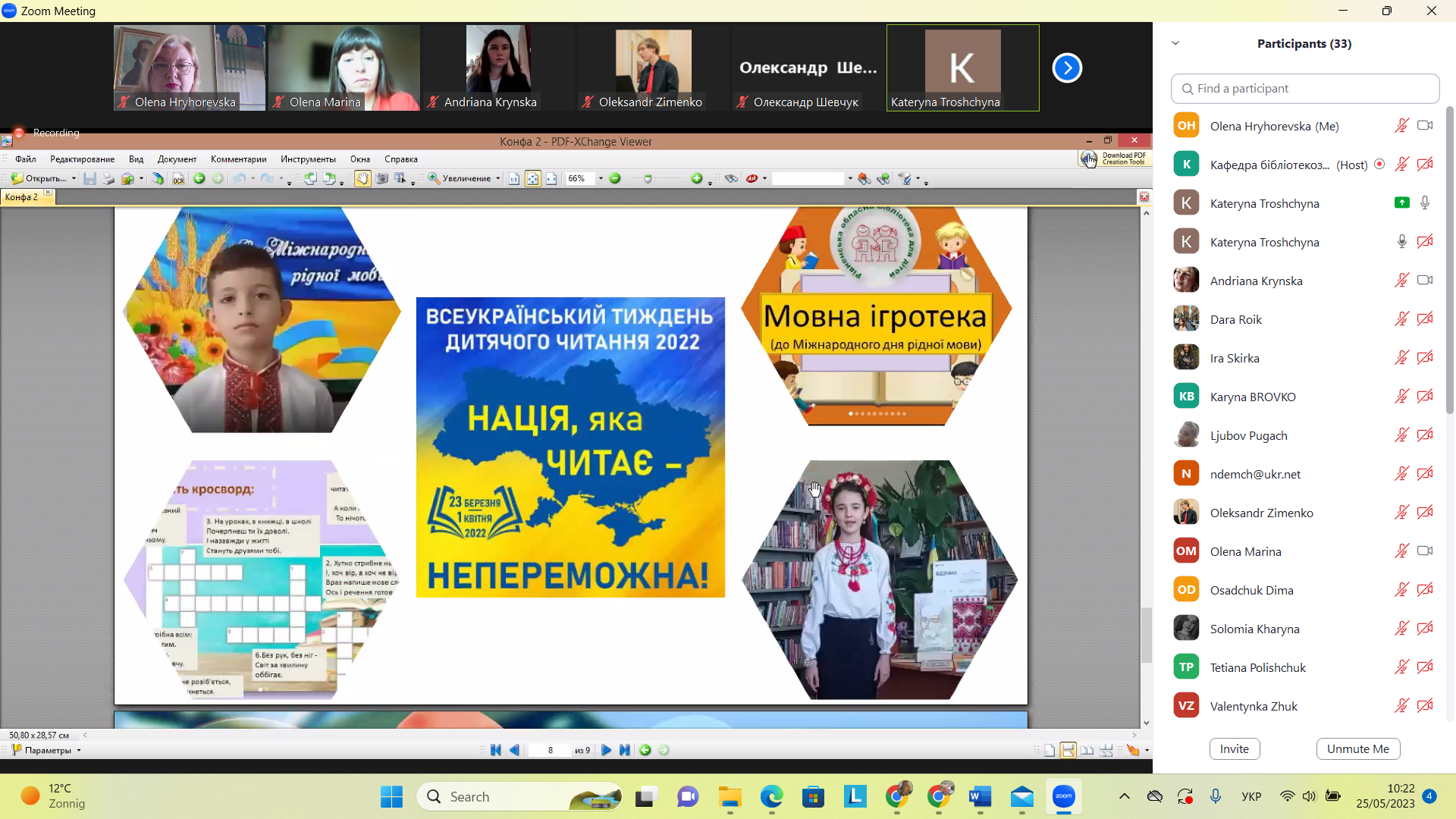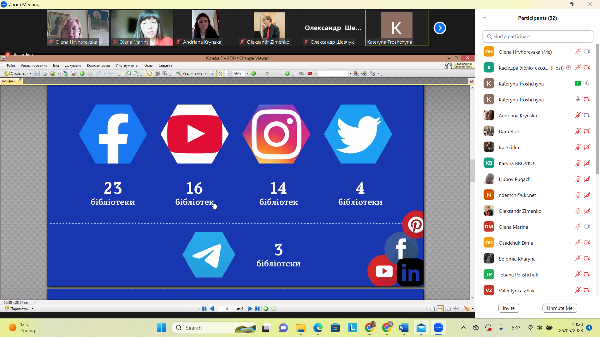 25 травня 2023 р. відбулася VIII Всеукраїнська (з міжнародною участю) наукова студентська інтернет-конференція «Інформація. Наука. Бібліотека. Весна», що об’єднала молодих науковців та їхніх наукових керівників з чотирьох закладів вищої освіти України та Польщі – Львіського національного університету імені Івана Франка, Харківської державної академії культури, Київського університету імені Бориса Грінченка, Вроцлавського університету. Із вітаннями до присутніх з нагоди зустрічі звернулися відомі українські фахівці з інформаційної справи – Роксана Білоусова (Львів), Олена Григоревська (Київ), Ірина Давидова (Харків), Олена Мар’їна (Харків).