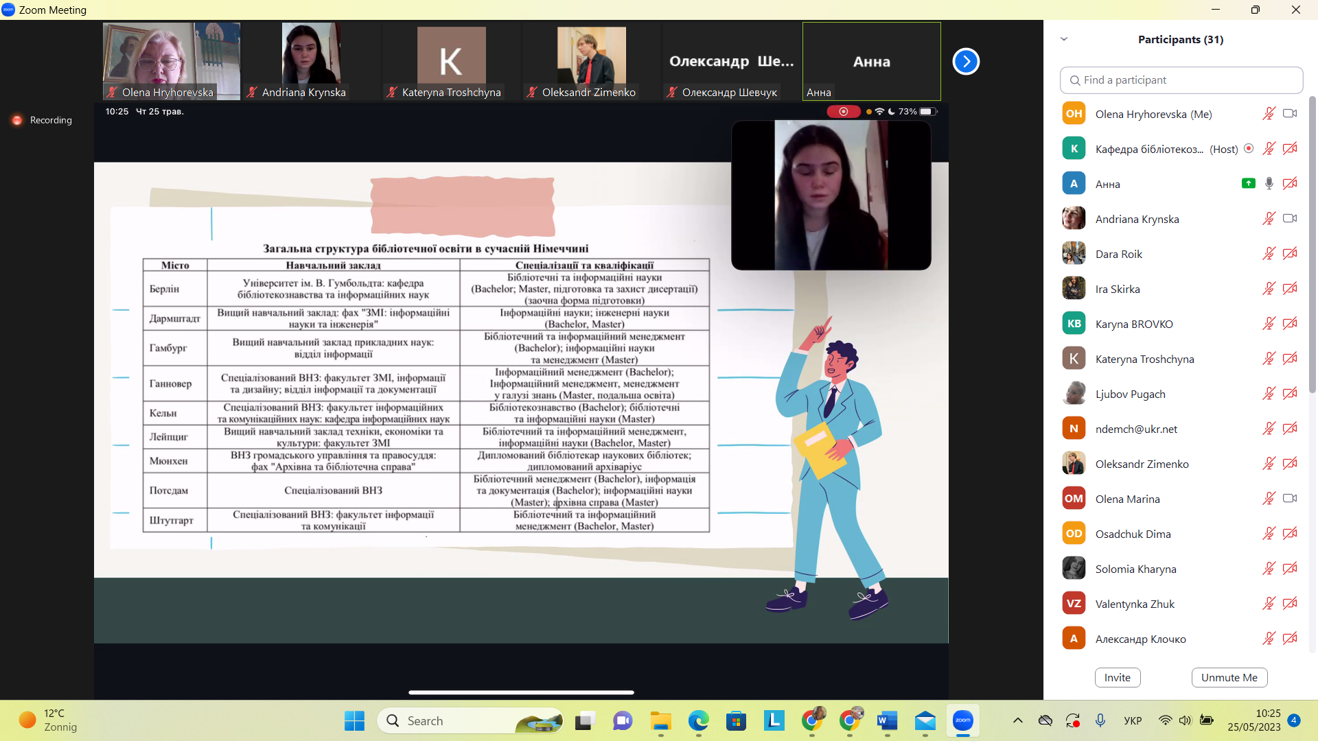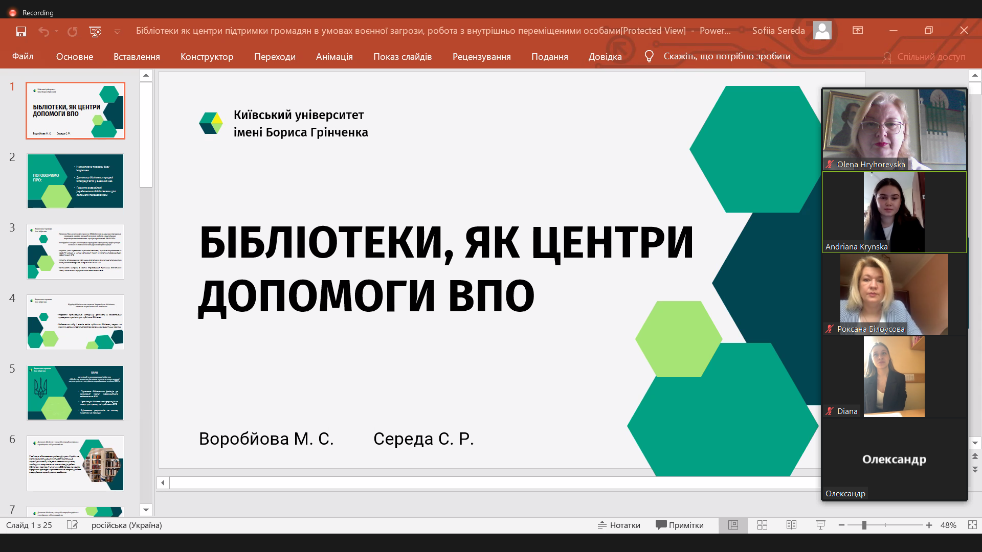 Університет Грінченка на конференції представили бакалаври спеціальності «Інформаційна, бібліотечна та архівна справа» Софія Середа та Марія Воробйова з виступом «Бібліотеки як центри допомоги внутрішньо переміщеним особам» (науковий керівник – Олена Григоревська, професор кафедри інформаційних комунікацій, доктор наук із соціальних комунікацій) та студент 1 курсу магістратури спеціальності «Інформаційна, бібліотечна та архівна справа» Олександр Шевчук із результатами дослідження «Соціокультурні трансформації та нові сервіси публічних бібліотек Австралії» (науковий керівник – Тетяна Поліщук, заступник декана Факультету журналістики).
