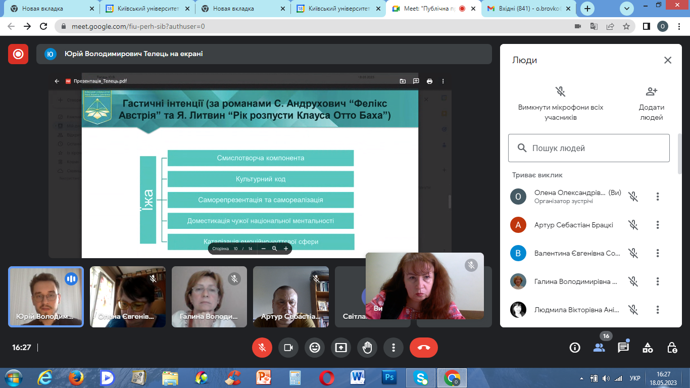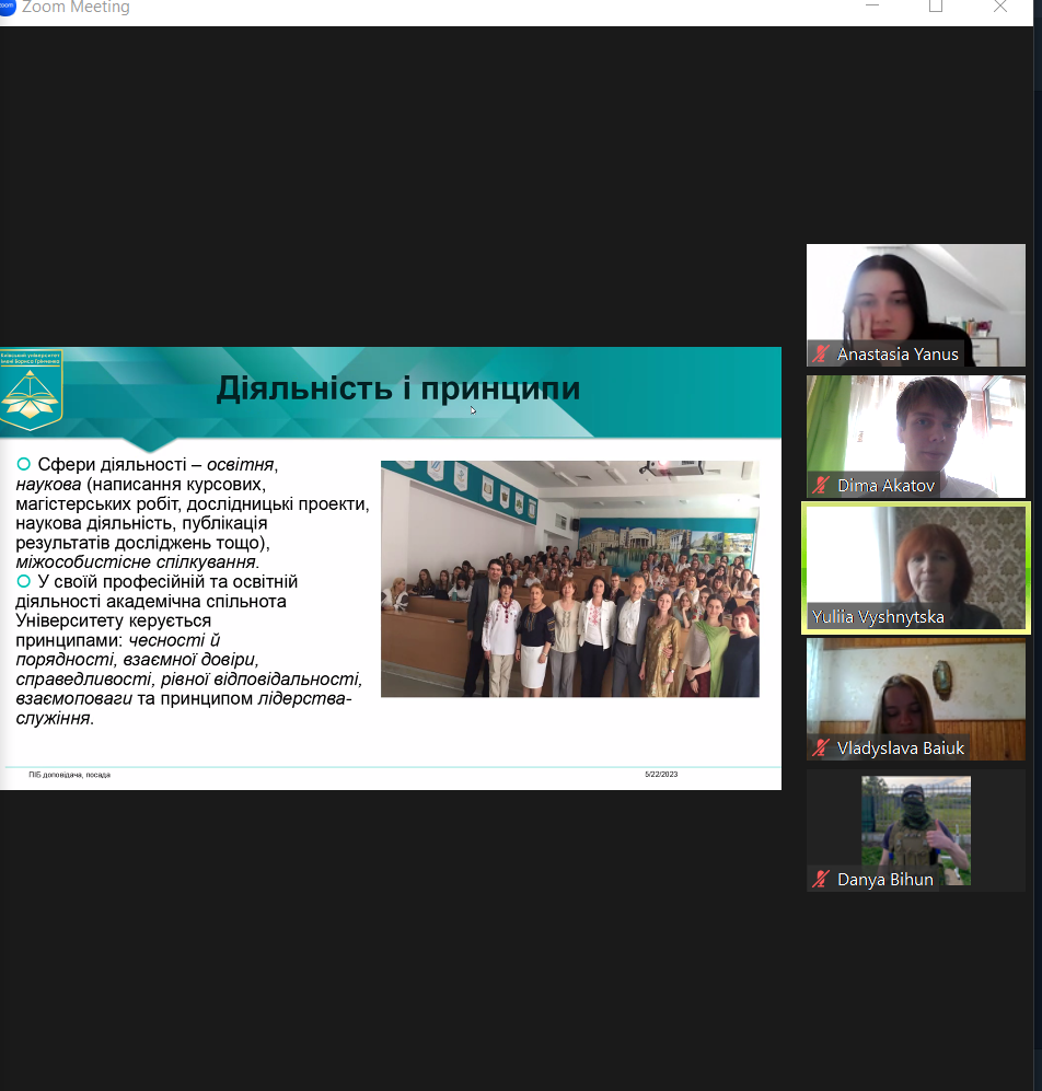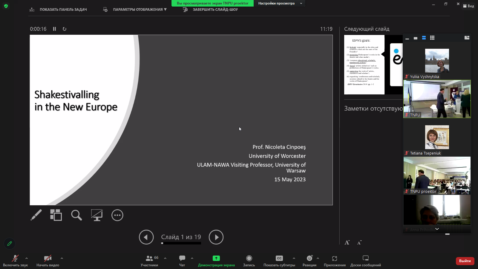 Студенти-грінченківці разом із модератором, Юлією Василівною Вишницькою, доктором філологічних наук, доцентом кафедри світової літератури, прослухали лекції професора Ніколети Чінпоеш (Вустерський Університет, Велика Британія) і взяли участь в обговоренні: «Who’s there»: Hamlet in post – 1989 Romania (11.05.2023); «Shakestivaling in Europe» (15.05.2023); «Female Agency in «The Merchant of Venice»» (16.05.2023).