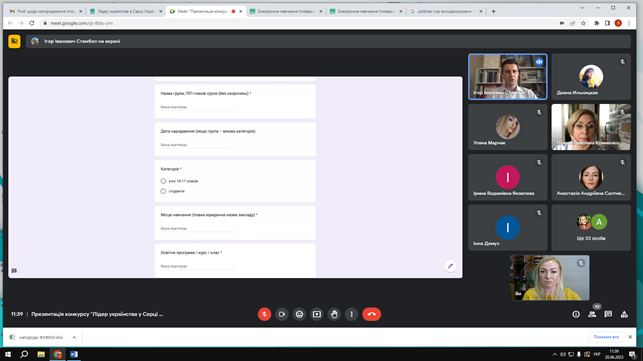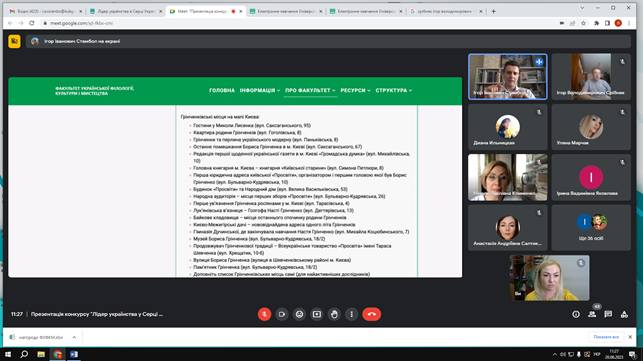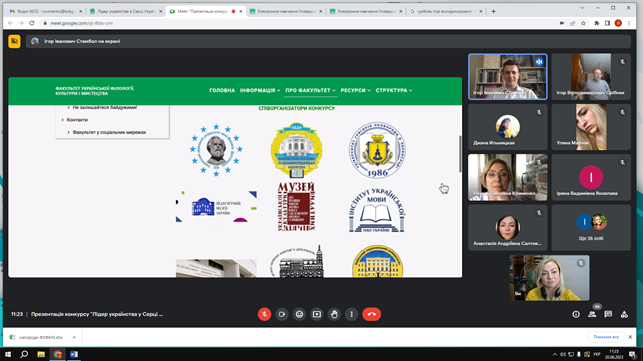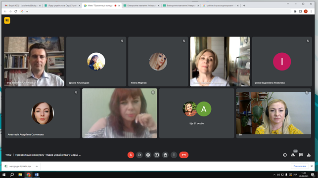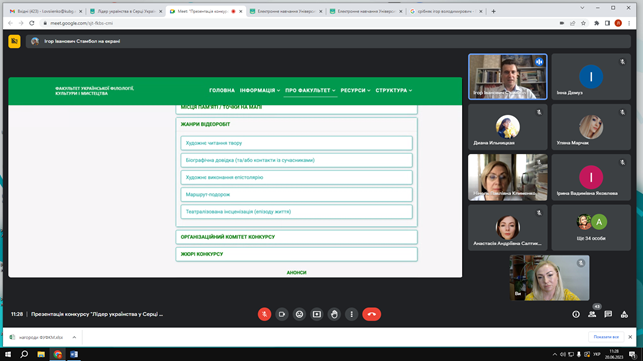 Модерував захід Стамбол Ігор Іванович, кандидат історичних наук, доцент кафедри інформаційних комунікацій Факультету української філології, культури і мистецтва, заступник голови організаційного комітету, який ознайомив присутніх з електронною сторінкою Конкурсу (https://fufkm.kubg.edu.ua/pro-fakultet/proiekty-fakultetu/lider-ukrayinstva-u-sertsi-ukrayiny.html#zhyuri-konkursu), документальною базою, основною ідеєю, метою, завданнями, номінаціями й жанрами майбутніх відеоробіт, презентував проморолик.
