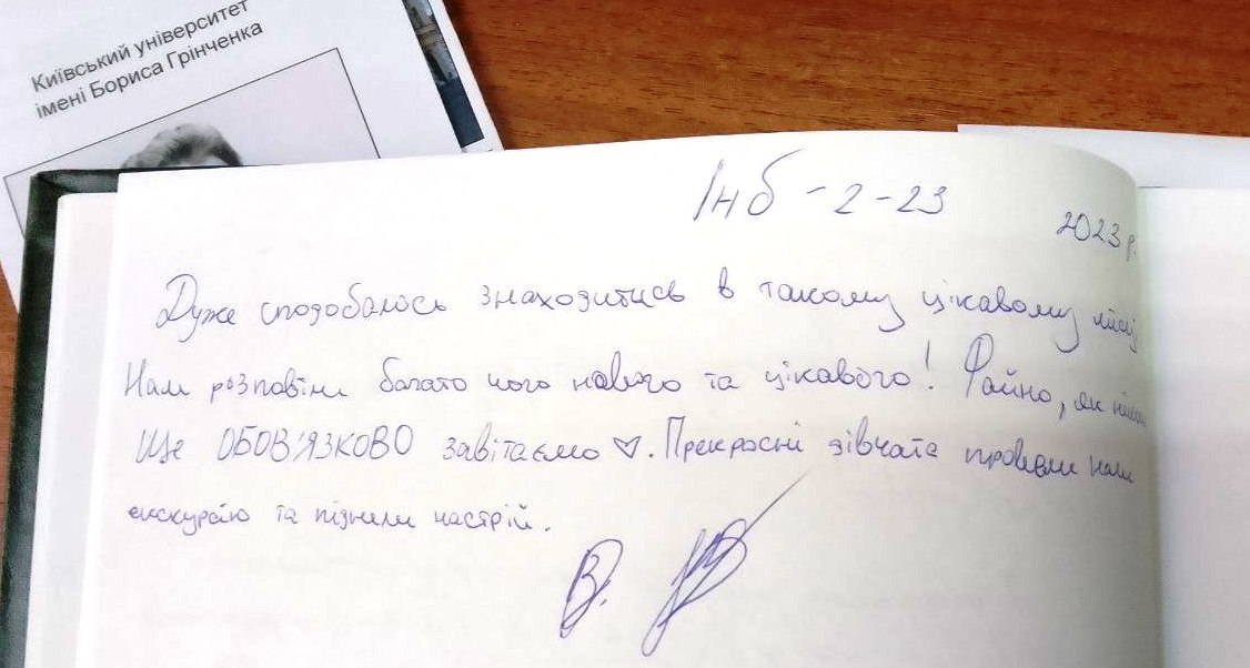 У межах навчальної дисципліни «Університетської студії: Я – студент» тривають екскурсії до Музею Бориса Грінченка для першокурсників Університету Грінченка. Справжньою «родзинкою» стало те, що до їх проведення долучилися студентки другого курсу ОП «Українська мова і література» (група УМЛб-1-22-4.0д), які під керівництвом наукових співробітників Музею та викладачів кафедри української літератури, компаративістики і грінченкознавства розпочали підготовку до осіннього марафону екскурсій ще влітку, під час літературно-краєзнавчої практики.
